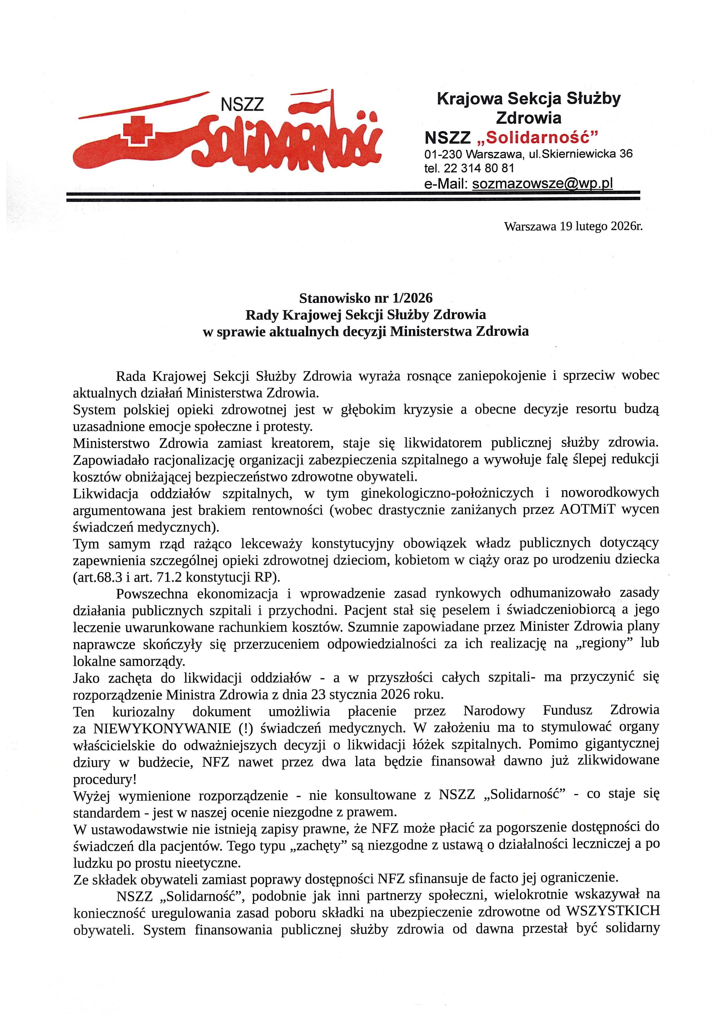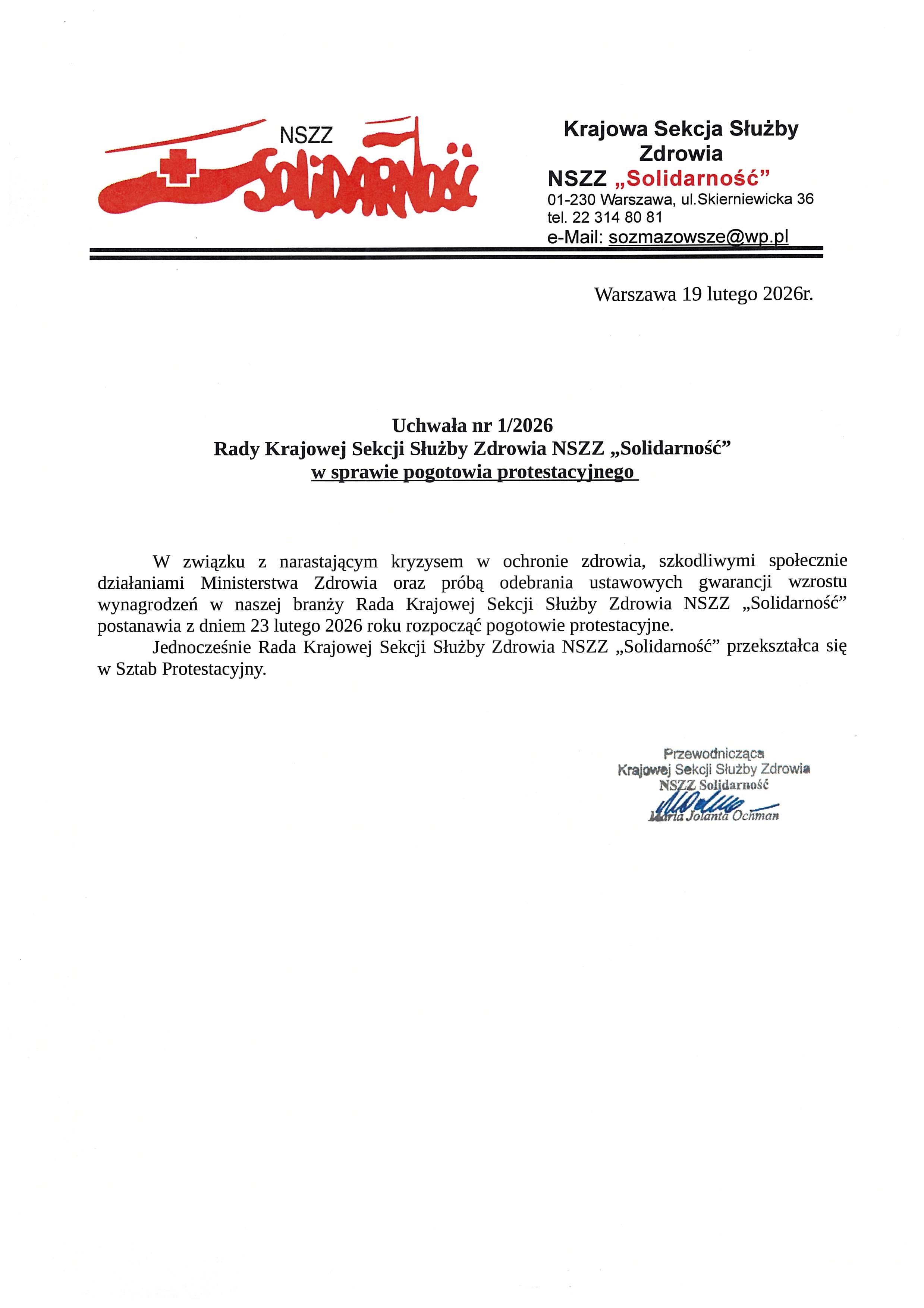 2026-02-20 14:05Krajowa Sekcja Służby Zdrowia NSZZ "Solidarność" ogłasza pogotowie protestacyjne
