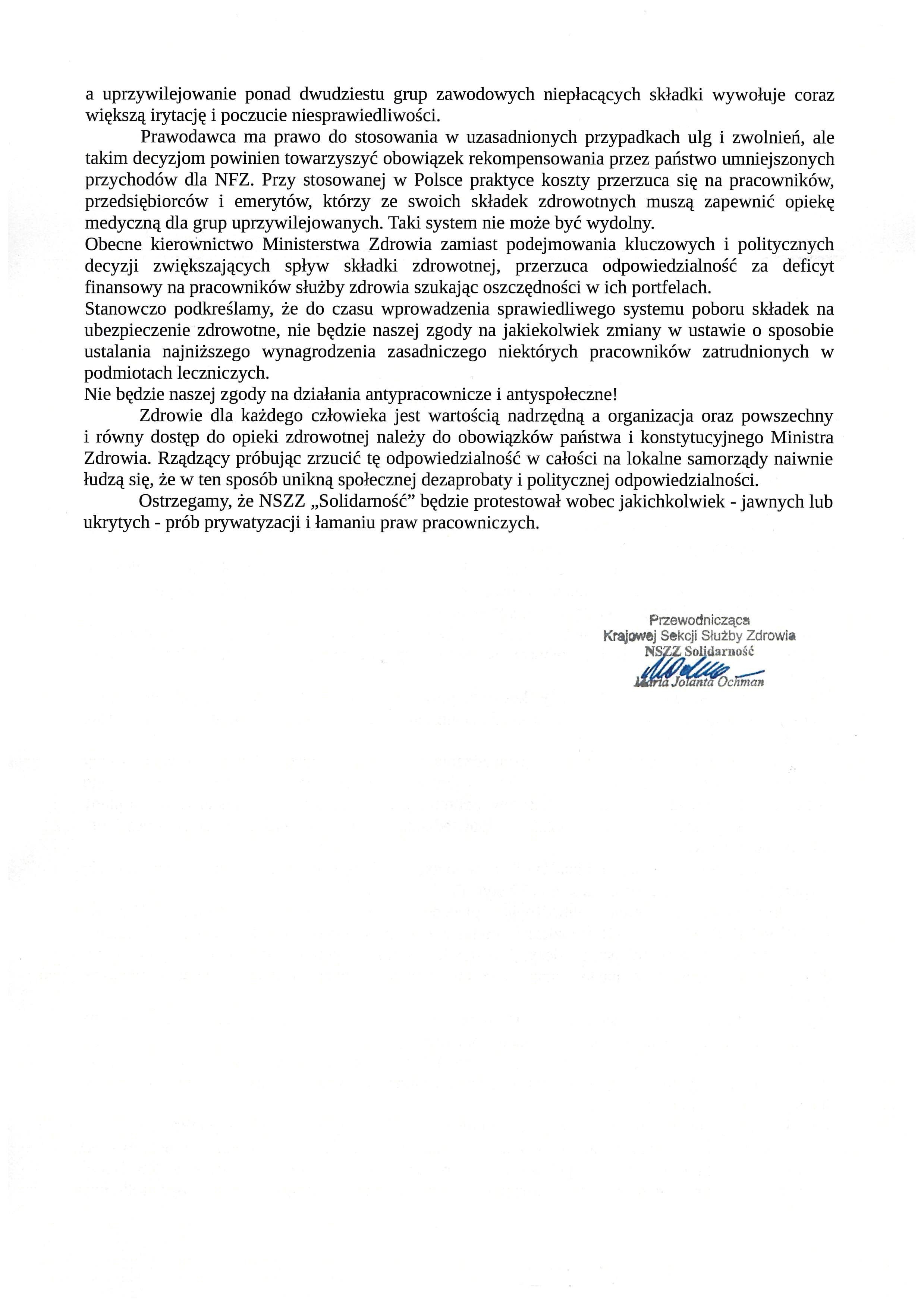 "Zdrowie dla każdego człowieka jest wartością nadrzędną a organizacja oraz powszechny i równy dostęp do opieki zdrowotnej należy do obowiązków państwa i konstytucyjnego Ministra Zdrowia. Rządzący próbując zrzucić tę odpowiedzialność w całości na lokalne samorządy naiwnie łudzą się, że w ten sposób unikną społecznej dezaprobaty i politycznej odpowiedzialności. Ostrzegamy, że NSZZ Solidamość" będzie protestował wobec jakichkolwiek - jawnych lub ukrytych - prób prywatyzacji i łamaniu praw pracowniczych".