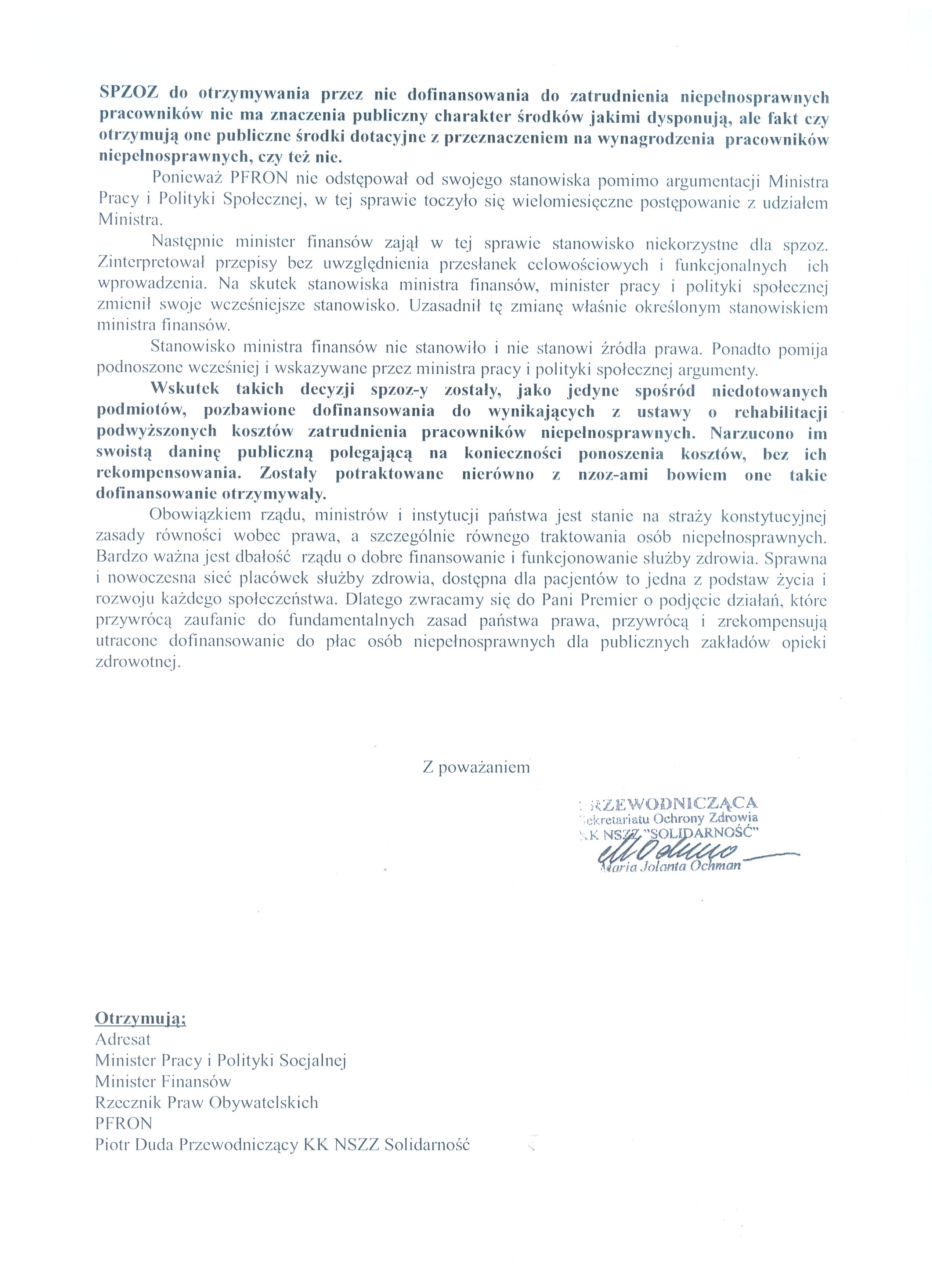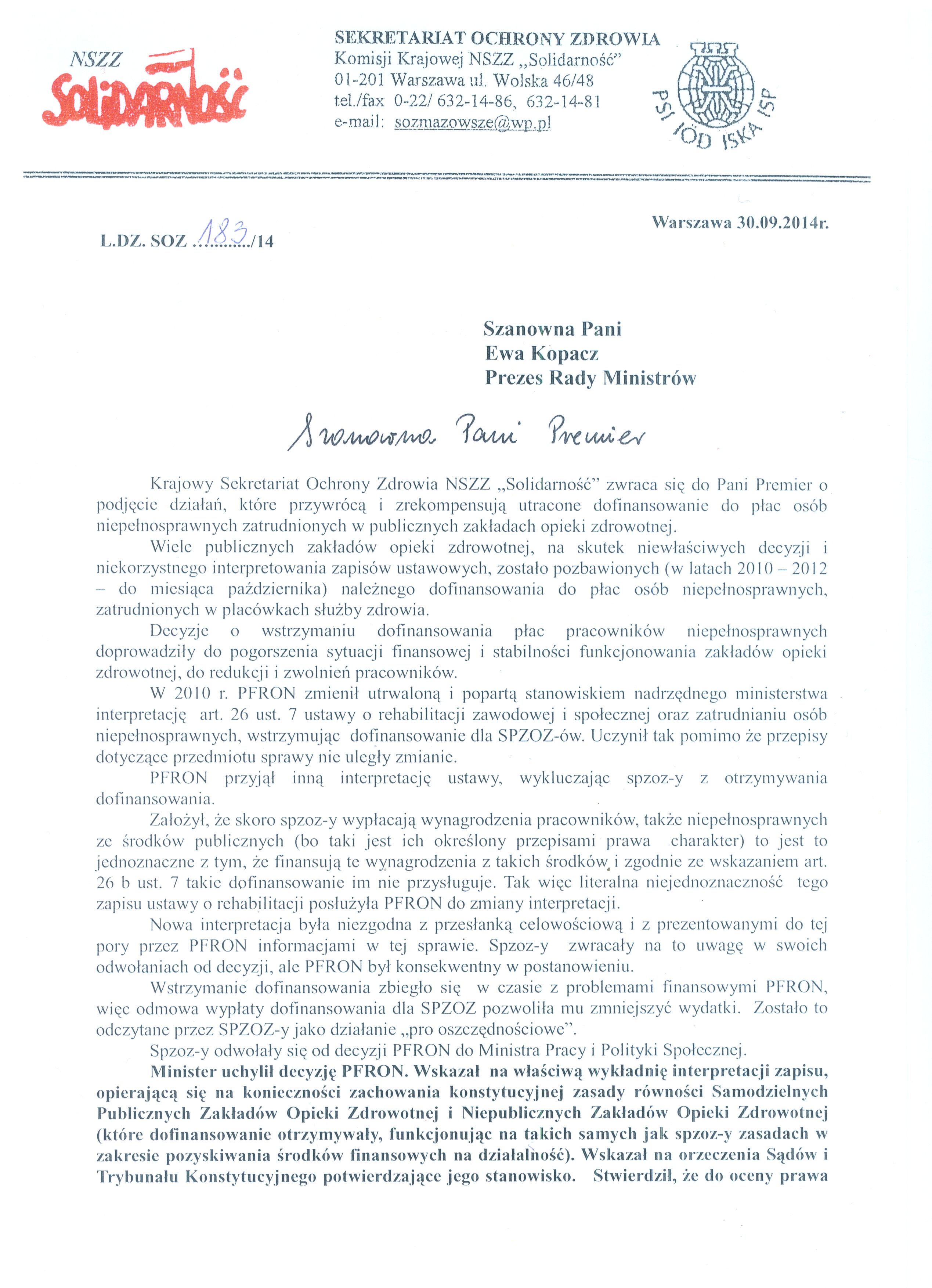 Poniżej zamieszczamy pismo do Premier Kopacz