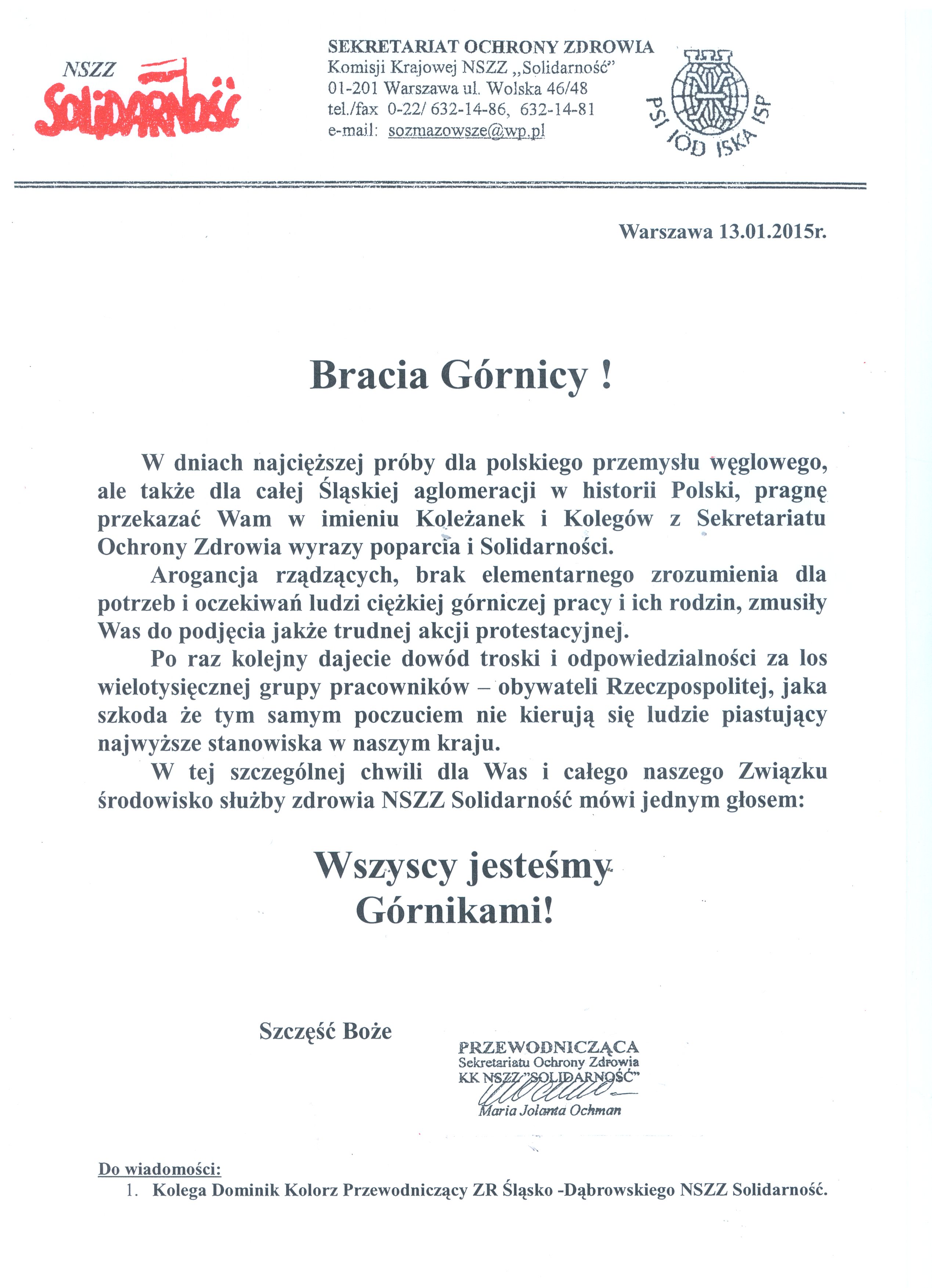 W dniach najcięższej próby dla polskiego przemysłu węglowego, ale także dla całej Śląskiej aglomeracji w historii Polski, pragnę przekazać Wam w imieniu Koleżanek i Kolegów z Sekretariatu Ochrony Zdrowia wyrazy poparcia i Solidarności.