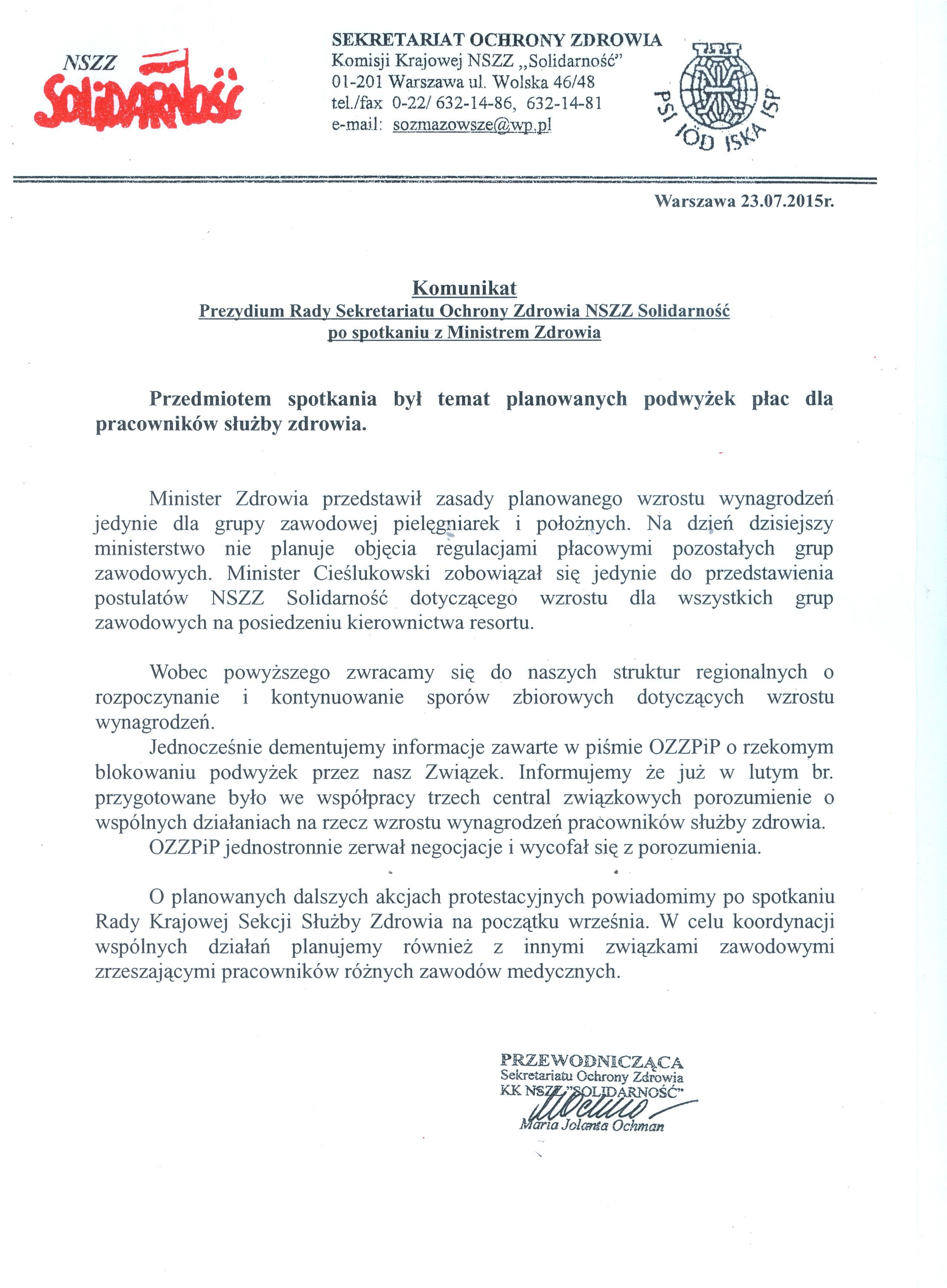 2015-07-24 10:21Komunikat Prezydium Rady Sekretariatu Ochrony Zdrowia NSZZ "Solidarność" po spotkaniu z Ministrem Zdrowia