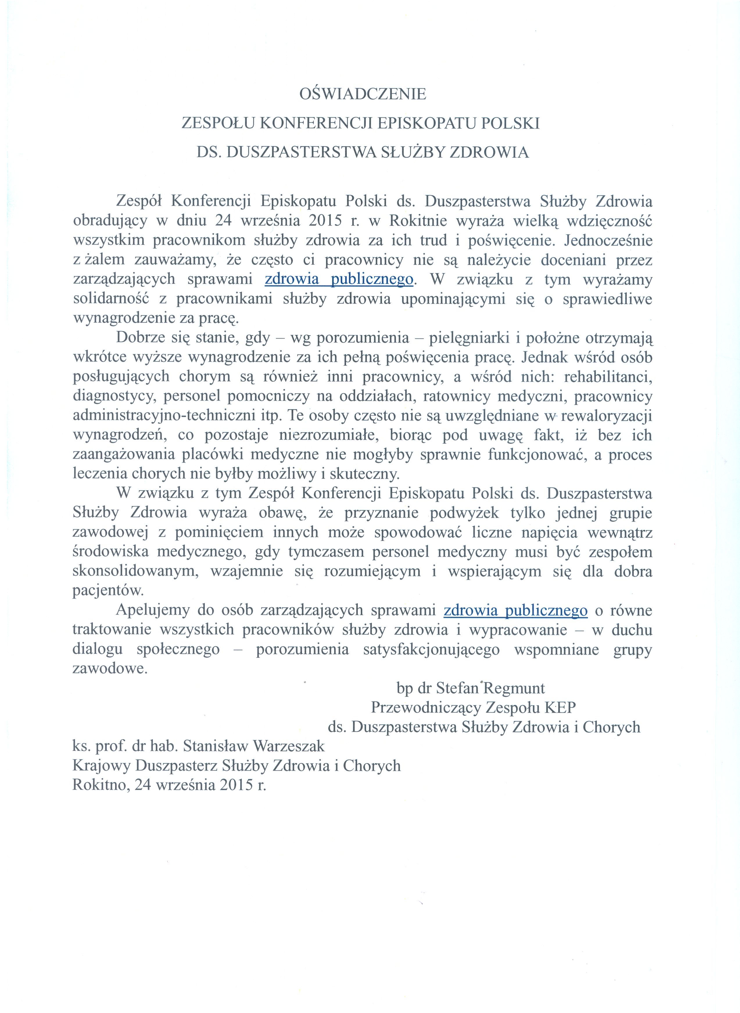 W imieniu Zespołu Oświadczenie podpisał bp dr Stefan Regmunt Przewodniczący Zespołu KEP ds. Duszpasterstwa Służby Zdrowia i Chorych