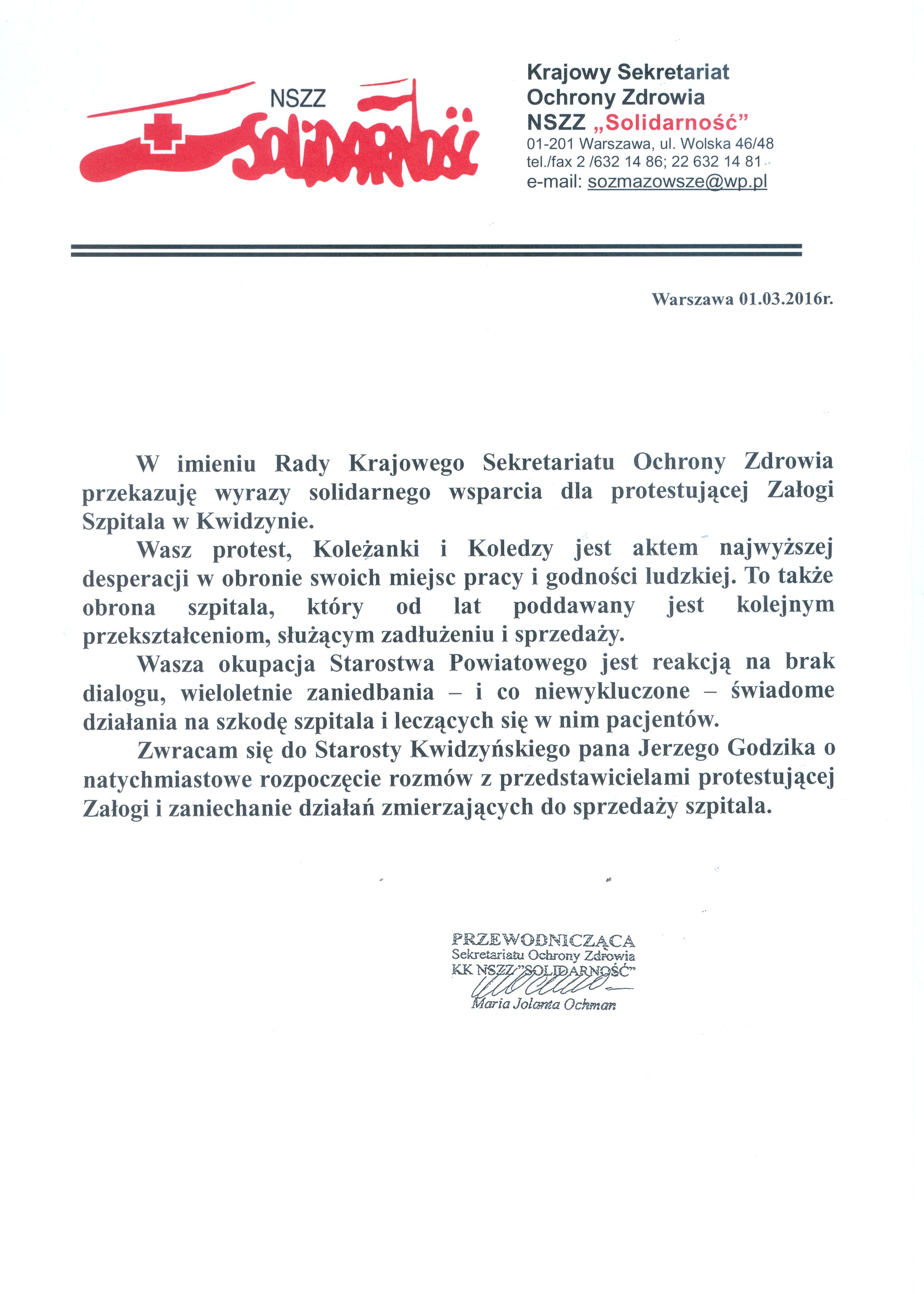 Wyrazy solidarnego wsparcia przekazała dziś związkowcom przewodnicząca Sekretariatu, która w Kwidzynie spotkała się z protestującą Załogą.