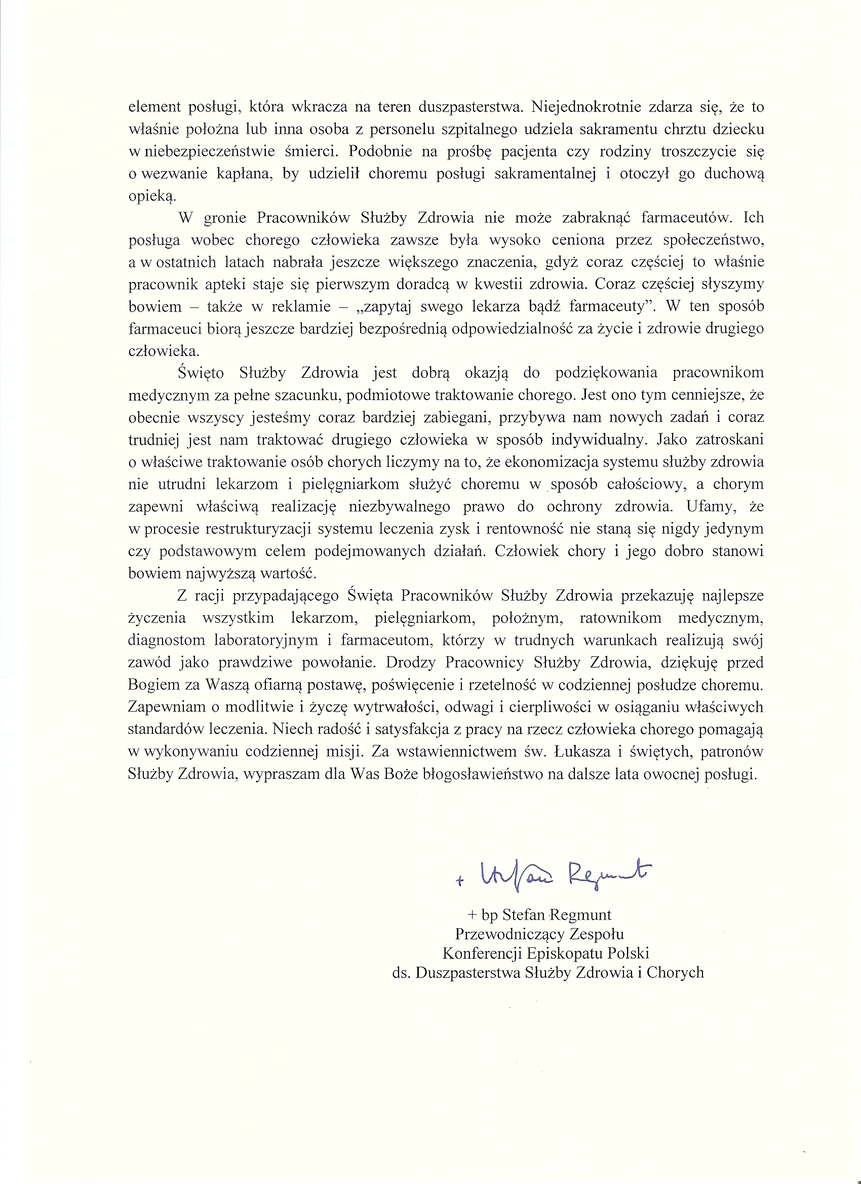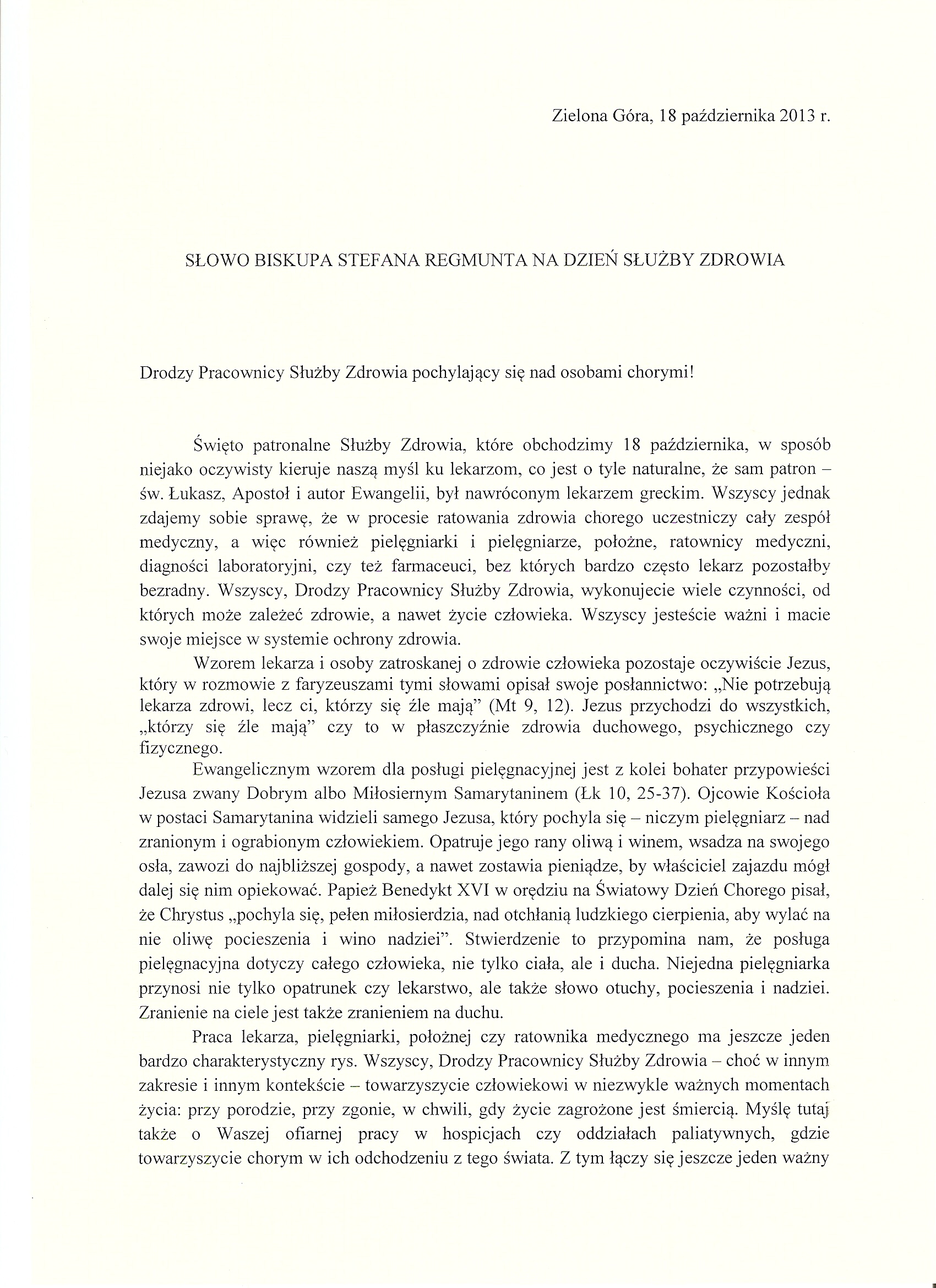 Å»yczenia dla Pracowników SÅ‚użby Zdrowia od Jego Ekscelencji KsiÄ™dza Biskupa Stefana Regmunta PrzewodniczÄ…cego ZespoÅ‚u Konferencji Episkopatu Polski ds. Duszpasterstwa SÅ‚użby Zdrowia i Chorych – z okazji przypadajÄ…cego 18 października 2013 r. Patronalnego ÅšwiÄ™ta SÅ‚użby Zdrowia.