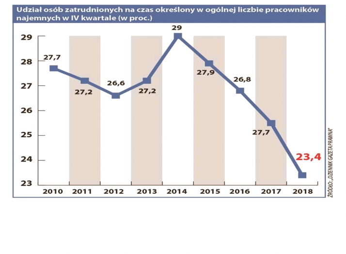 W Polsce umowę na czas określony miało na koniec ub.r. 23,4 proc. pracowników. W 2014 r. było to 29 proc., w 2015 27,9 proc., w 2016 zaś 26,8 proc., a w 2017 25,5 proc. To korzystny trend, ale nadal jesteśmy w ogonie UE. Więcej procentowo zatrudnionych na czas określony jest tylko w Hiszpanii 27,5 proc. Według danych Eurostatu za III kwartał ub.r. wskazują na średnią dla UE na poziomie 14,4 proc.