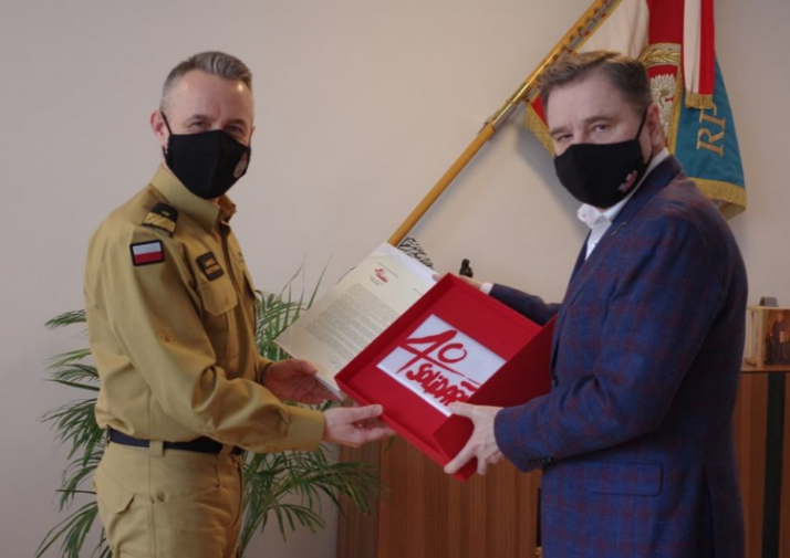 Piotr Duda wręczył komendantowi flagę „Solidarności” z logiem 40-lecia Związku.