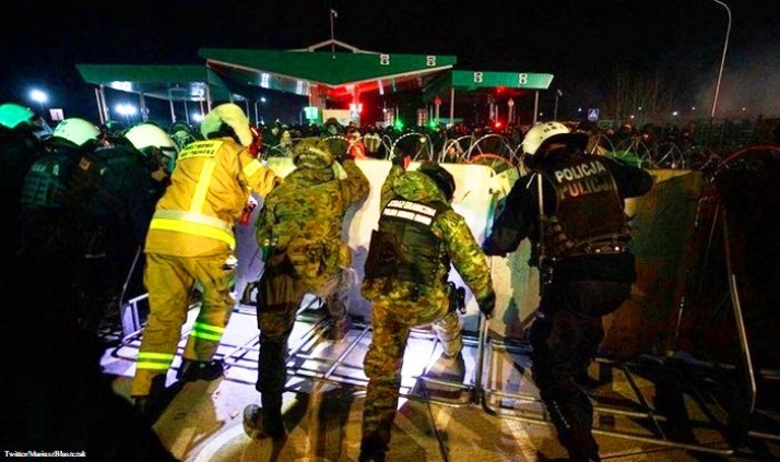 Apogeum działań nastąpiło 16 listopada br. gdy migranci przypuścili szturm na zamknięte przejście graniczne w Kuźnicy. Cudzoziemcy obrzucali polskich pograniczników i żołnierzy kamieniami oraz innego rodzaju przedmiotami. To wtedy właśnie zrobiono zdjęcia, które opublikował na Twitterze szef MON Mariusz Błaszczak. Widać na nich żołnierzy i funkcjonariuszy różnych formacji, którzy współpracują przy zabezpieczeniu przejścia granicznego w Kuźnicy. Wśród nich nie mogło zabraknąć strażaków.