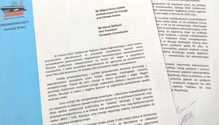 Szef śląsko-dąbrowskiej "Solidarności" Dominik Kolorz skierował list do wiceprzewodniczącego Komisji Europejskiej, komisarza ds. unii energetycznej  Maroša Šefčoviča  oraz do komisarza ds. działań w dziedzinie klimatu i energii  Miguela Ariasa Cañete'a,  w którym skrytykował obecną politykę klimatyczno-energetyczną forsowaną przez Komisję Europejską i publiczne wypowiedzi obu komisarzy w sprawie nieuchronności całkowitej dekarbonizacji gospodarki Wspólnoty. Podkreślił, że działania KE w tej sferze noszą znamiona dyskryminacji  uboższych państw Wspólnoty.