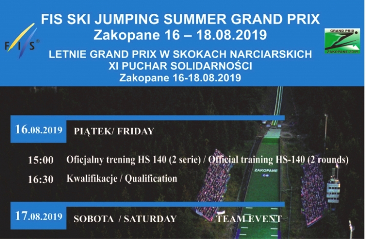 Komisja Krajowa NSZZ "Solidarność" i Region Małopolski NSZZ "Solidarność" zapraszają do Zakopanego w dniach 16-18 sierpnia 2019 r. na Letnie Grand Prix w Skokach Narciarskich XI Puchar Solidarności.