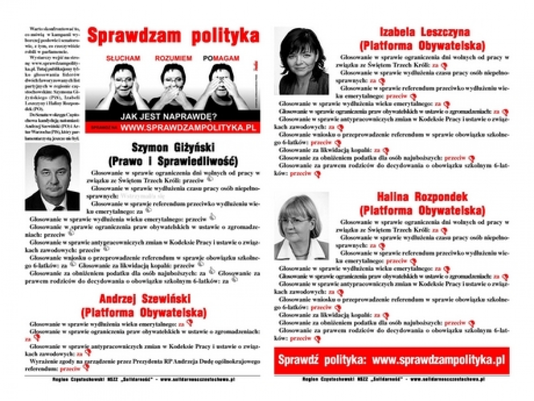 Od 21 października Region Częstochowski NSZZ "Solidarność" prowadzi intensywną ogólnozwiązkową gazetowo-ulotkową akcję informacyjną "Sprawdzam polityka".