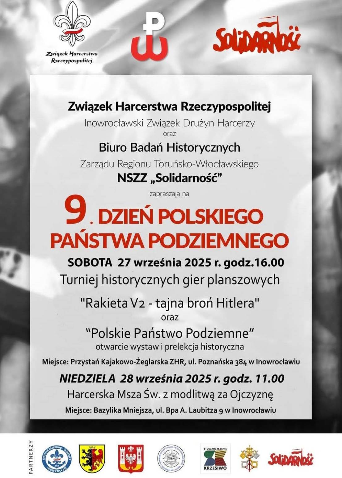 Już po raz dziewiąty w Inowrocławiu odbyły się obchody Dnia Polskiego Państwa Podziemnego. Jest to wspólne przedsięwzięcia Związku Harcerstwa Rzeczypospolitej oraz Biura Badań Historycznych Zarządu Regionu Toruńsko-Włocławskiego NSZZ Solidarność. Tym razem dla uczestników przygotowano turniej gier planszowych, który okazał się znakomitą zabawą zarówno dla dzieci jak i dorosłych. Po zakończeniu zmagań goście mogli wysłuchać prelekcji Mateusza Szłapki z bydgoskiej Delegatury IPN o fenomenie Polskiego Państwa Podziemnego. Po wykładzie odbyła się dyskusja.