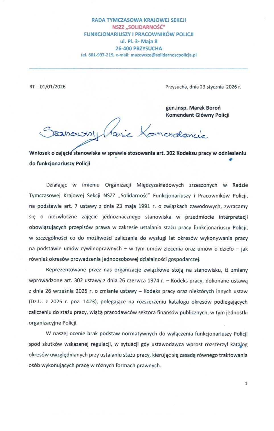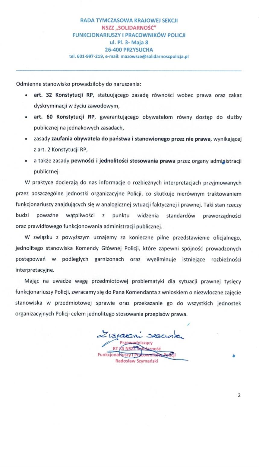 NSZZ „Solidarność” zawsze stoi na straży równego traktowania i ochrony interesów członków związku zawodowego, dlatego też zwróciliśmy się do Komendanta Głównego Policji gen. insp. Marka Boronia o zajęcie stanowiska w sprawie.