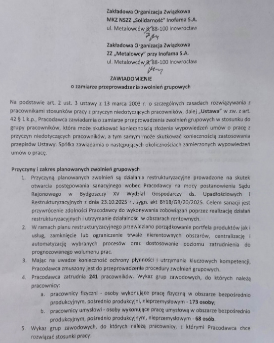 Jak już informowaliśmy – w inowrocławskiej Inofamie powstała trudna sytuacja mogąca zagrozić nie tylko utrzymaniu dotychczasowych miejsc pracy, lecz w ogóle istnieniu samej firmy. NSZZ Solidarność aktywnie włączyła się w proces konsultacji z Zarządem Zakładu. Tymczasem dwa działające tam związki zawodowe otrzymały pismo sygnowane przez „Inofama S.A. w restrukturyzacji” z następującym komunikatem (