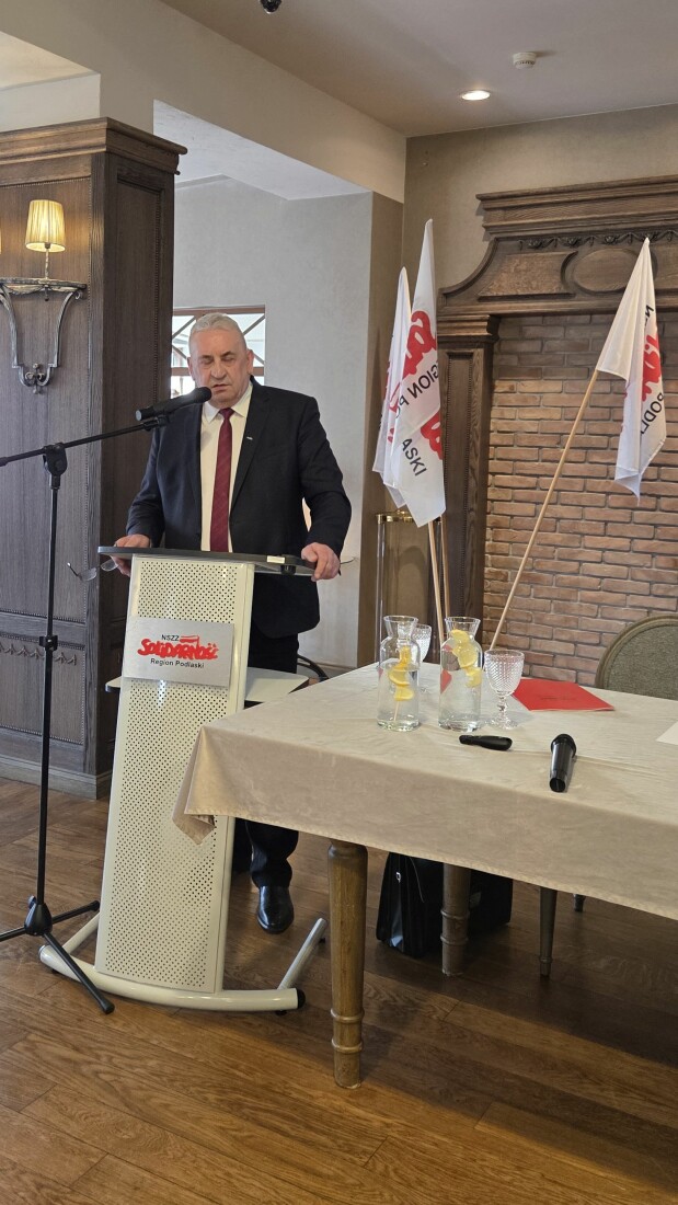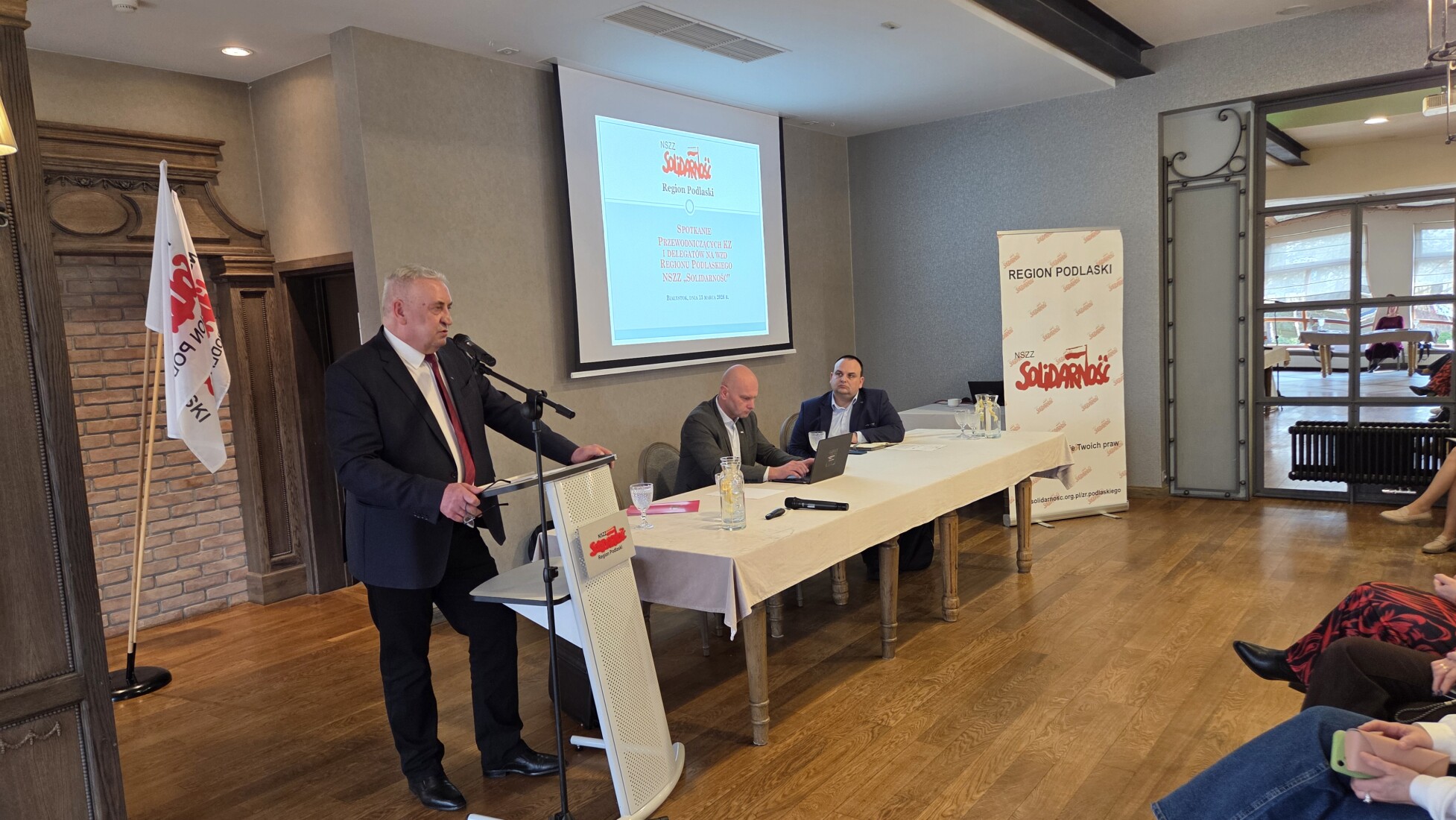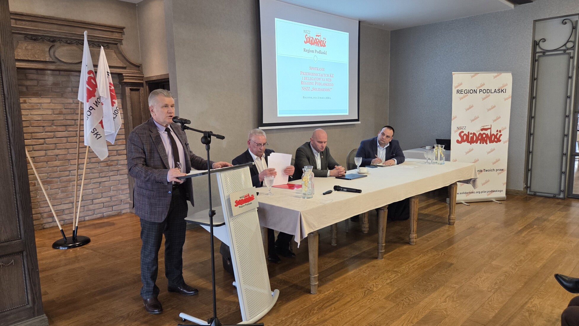 Blisko 100 osób uczestniczyło w piątek 13 marca br. w spotkaniu przewodniczących Komisji Zakładowych oraz delegatów Regionu Podlaskiego NSZZ „Solidarność”. Gościem spotkania był zastępca przewodniczącego Komisji Krajowej NSZZ „Solidarność” Bartłomiej Mickiewicz, który przedstawił aktualne informacje dotyczące działalności Komisji Krajowej oraz najważniejsze kierunki działań związku w najbliższym czasie.