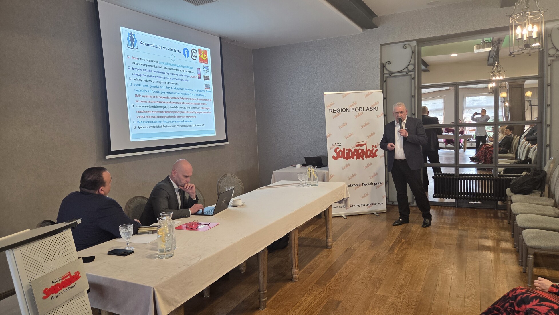 Spotkanie otworzył przewodniczący Zarządu Regionu Podlaskiego, Józef Mozolewski, który omówił najważniejsze wydarzenia oraz bieżące problemy w Regionie. Przewodniczący przedstawił także dane dotyczące uzwiązkowienia, dziękując szczególnie tym organizacjom, którym udało się uzyskać największy przyrost członków. Najlepiej pod tym względem wypadły organizacje związkowe w Izbie Administracji Skarbowej, Uniwersyteckim Dziecięcym Szpitalu Klinicznym, Służbie Więziennej oraz firmie Adampol. Następnie Kierownik Działu Prawnego Dariusz Borowski omówił specyfikę spraw prowadzonych przez Biuro Prawne Regionu. Sprawozdanie z działalności Działu Organizacyjno – Szkoleniowego przedstawiła jego kierownik Izabela Żmojda. Skarbnik ZR Maciej Łozowski omówił natomiast benefity z jakich korzystać mogą członkowie Związku oraz zachęcił do korzystania ze strony internetowej Regionu, gdzie można znaleźć wszystkie potrzebne informacje.