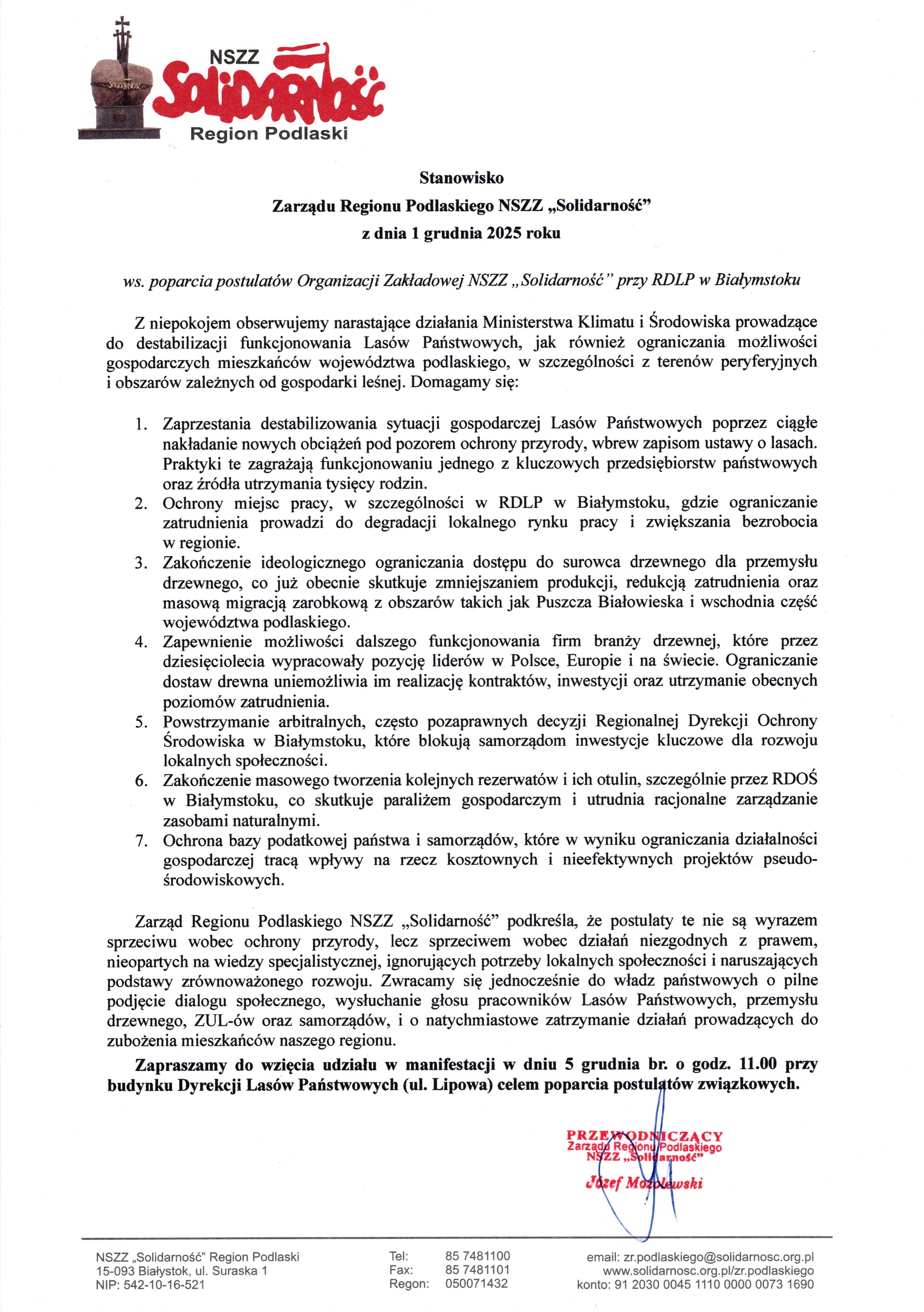 Solidarność Podlaska poparła postulaty zgłoszone przez OZ NSZZ "Solidarność" przy Regionalnej Dyrekcji Lasów Państwowych w Białymstoku oraz Krajową Sekcję Pracowników Leśnictwa NSZZ "Solidarność". Przedstawiła swoje stanowisko w skierowanym m.in. do Ministerstwa Klimatu i Środowiska oraz Regionalnej Dyrekcji Lasów Państwowych w Białymstoku piśmie, które zamieszczamy poniżej: