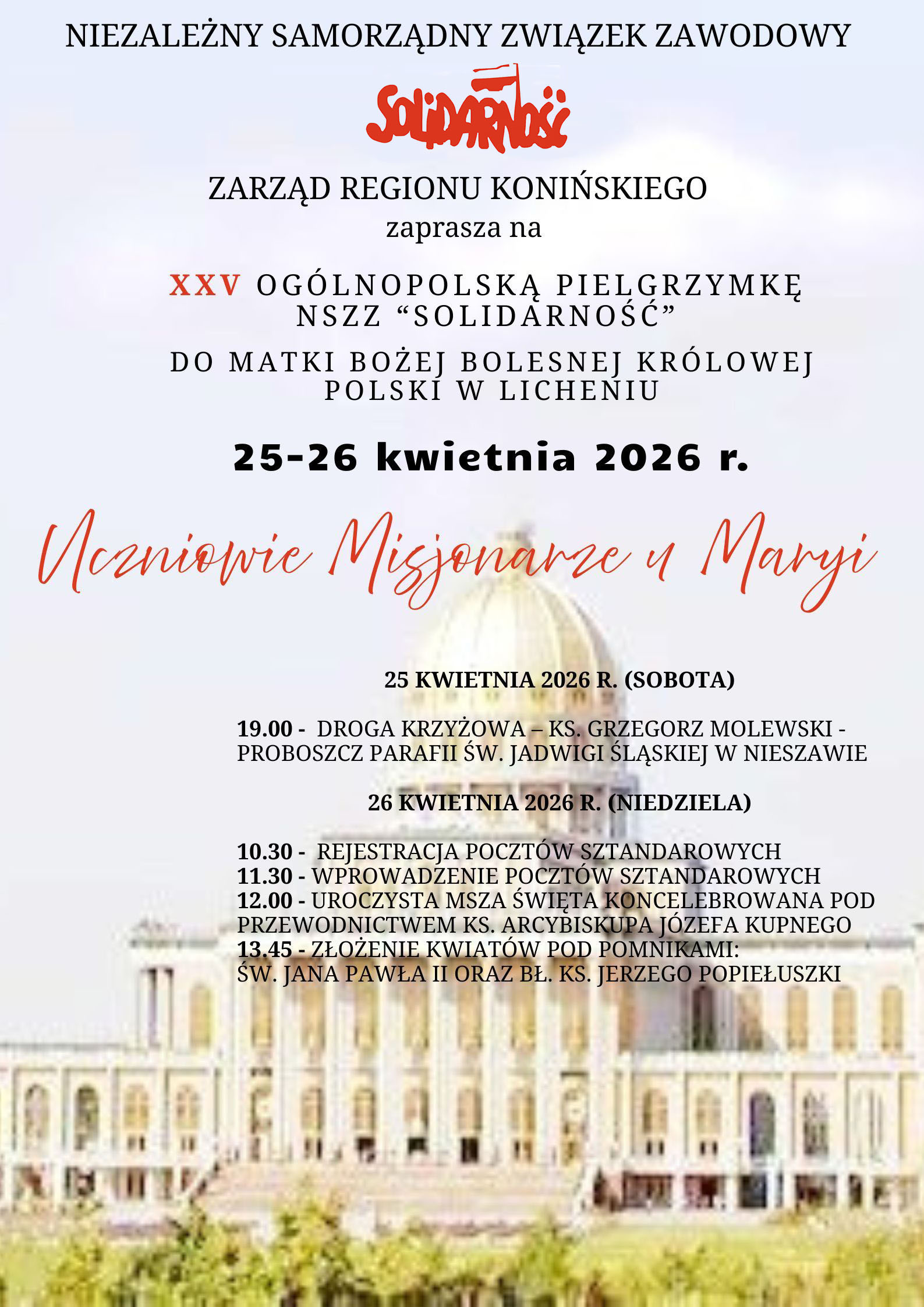 Region Podlaski NSZZ "Solidarność" zaprasza członków Związku oraz wszystkich zainteresowanych do udziału w pielgrzymce do Lichenia. Wspólna modlitwa w Sanktuarium Matki Bożej Bolesnej Królowej Polski odbędzie się w dniach 25-26 kwietnia.