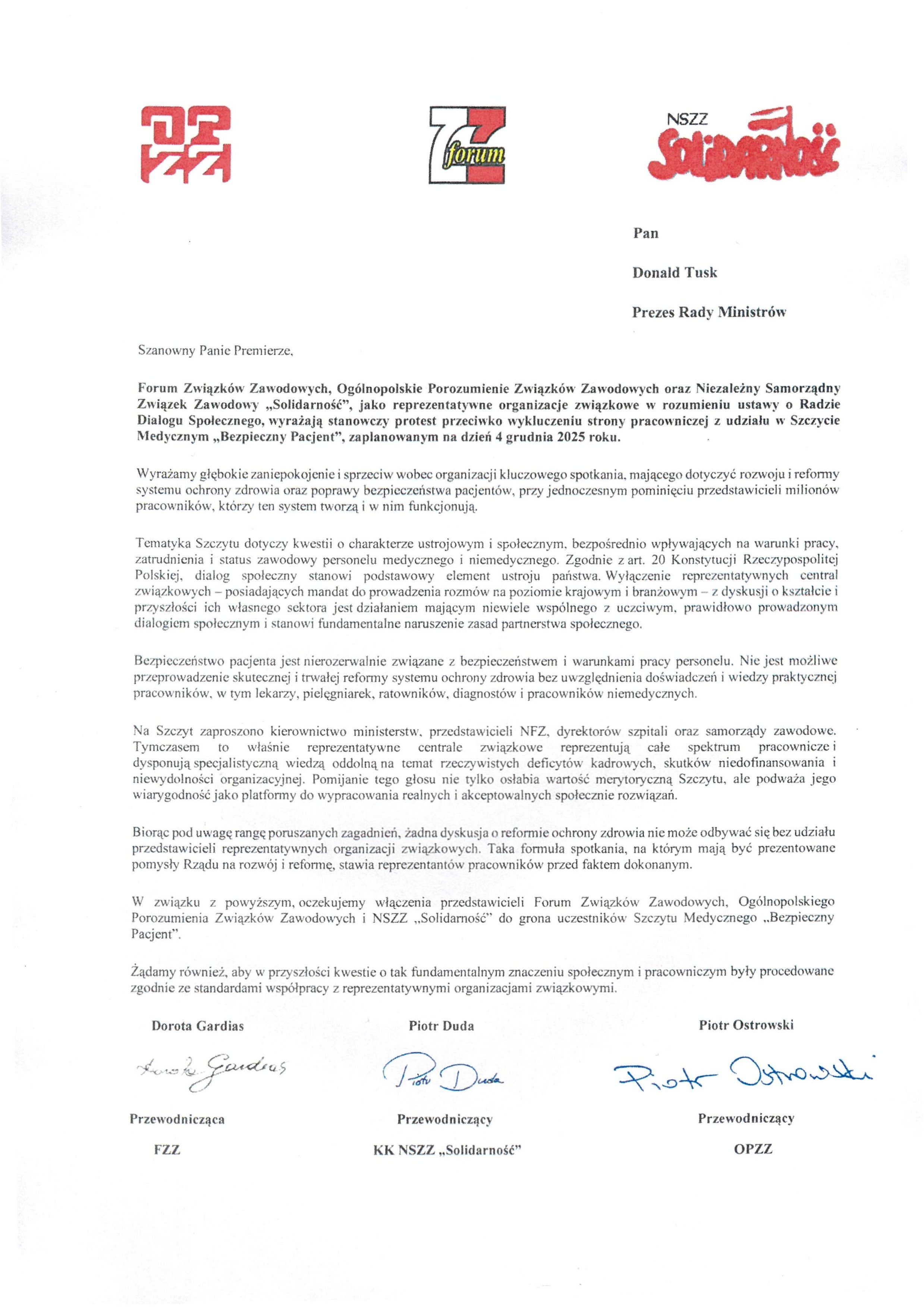 2025-12-04 11:07Protest 3 central związkowych ws. niezaproszenia na rządowy Szczyt Medyczny