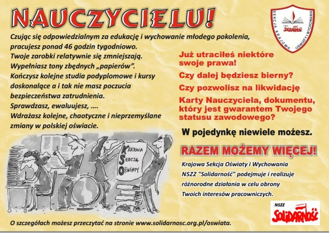 Oświatowa „Solidarność” zaostrza protest i nie wyklucza ogólnopolskiego strajku nauczycieli i pracowników placówek oświatowych. Akcja protestacyjna wśród nauczycieli-związkowców z „Solidarności” prowadzona jest od września ubiegłego roku. - Przez cały rok szkolny nie doczekaliśmy się od ministra edukacji narodowej reakcji na nasze postulaty. Dlatego zdecydowaliśmy o zaostrzeniu protestu - mówiła Teresa Misiuk, przewodnicząca Regionalnej Sekcji Oświaty i Wychowania NSZZ "Solidarność" w Lublinie, podczas konferencji prasowej, zorganizowanej 15 kwietnia br.
