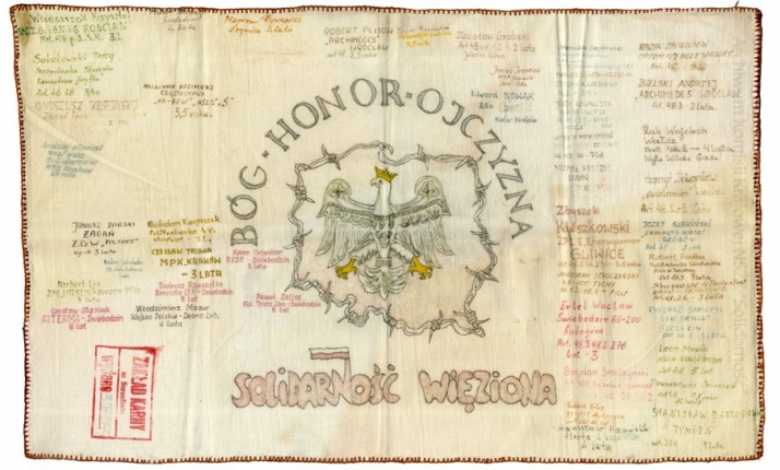Z pewnością podobne znaczenie ma przekazana ostatnio do Archiwum "Solidarności” makatka, która została wykonana w 1982 roku przez więźniów politycznych w Zakładzie Karnym w Strzelinie. Ten mierzący 42x70 cm kawałek płótna, w swojej centralnej części posiada wyrysowanego orła w koronie, otoczonego konturem Polski w formie drutu kolczastego. Wyjątkowe godło wieńczy napis Bóg – Honor – Ojczyzna, Solidarność Więziona, wokół niego znajdują się zaś podpisy więźniów wraz z informacjami o otrzymanych przez nich sankcjach. W oczy rzuca się również pieczęć ZK w Strzelinie umieszczona w momencie wydania depozytu.