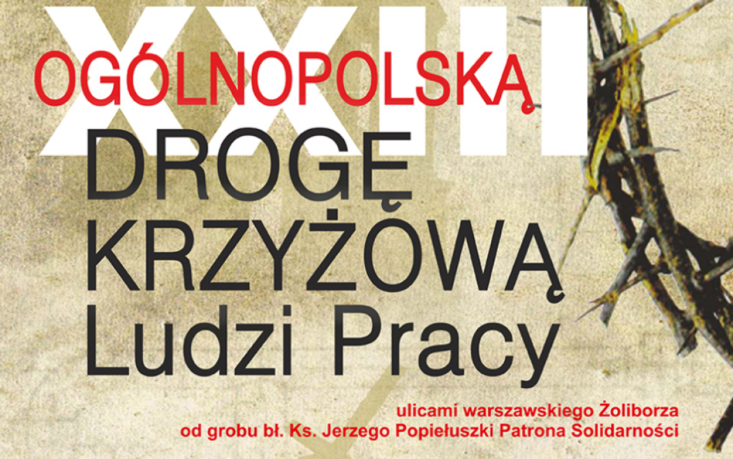 XXIII Ogólnopolska Droga Krzyżowa Ludzi Pracy odbędzie się 31 marca (piątek) 2023 r. Tegoroczne rozważania skupią się na słowach patrona "Solidarności" bł. ks. Jerzego Popiełuszi: "Tylko ludzie silni nadzieją są zdolni przetrwać wszelkie trudności". Wierni będą modlić się w intencji zjednoczenia Narodu i Kościoła wobec wyzwań współczesności.