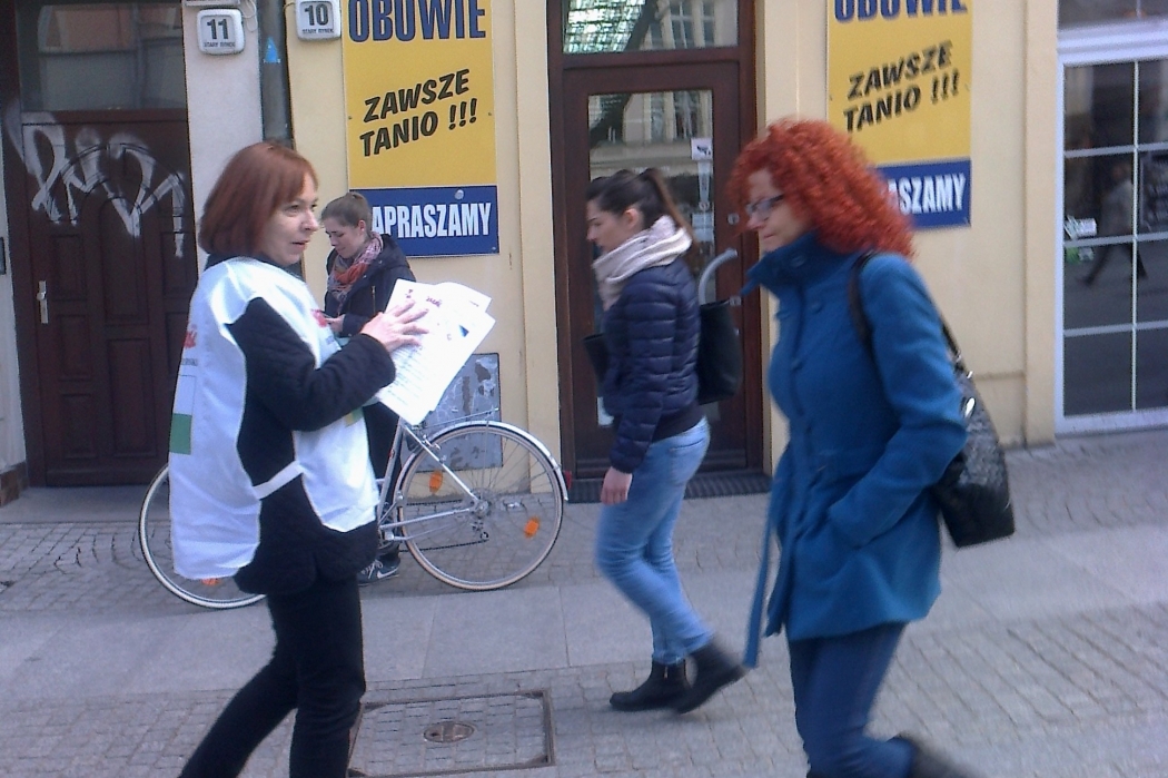 W drodze do biura posła PSL Józefa Zycha rozdawaliśmy ulotki z postulatami i wynikami głosowań, zachęcając mieszkańców miasta do zapamiętania parlamentarzystom ich decyzji, zwłaszcza przy urnach wyborczych. Ta część akcji nie była łatwa do wykonania, bo w Zielonej Górze trwają wybory samorządowe i ludzie są trochę zmęczeni ulotkami. Ożywiali się jednak, gdy dowiadywali się, że my akurat nie zachęcamy do głosowania na te osoby, a nawet wręcz przeciwnie. Komentarzy na temat wybrańców narodu nie będziemy przytaczać.