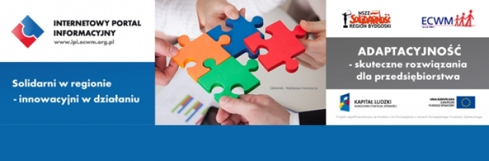 Region Bydgoski NSZZ „Solidarność” wraz z Europejskim Centrum Współpracy Młodzieży serdecznie zapraszają do udziału w KONFERENCJI pt. „Adaptacyjność – skuteczne rozwiązania dla przedsiębiorstw” realizowanej w ramach projektu pn. Solidarni w regionie – innowacyjni w działaniu.