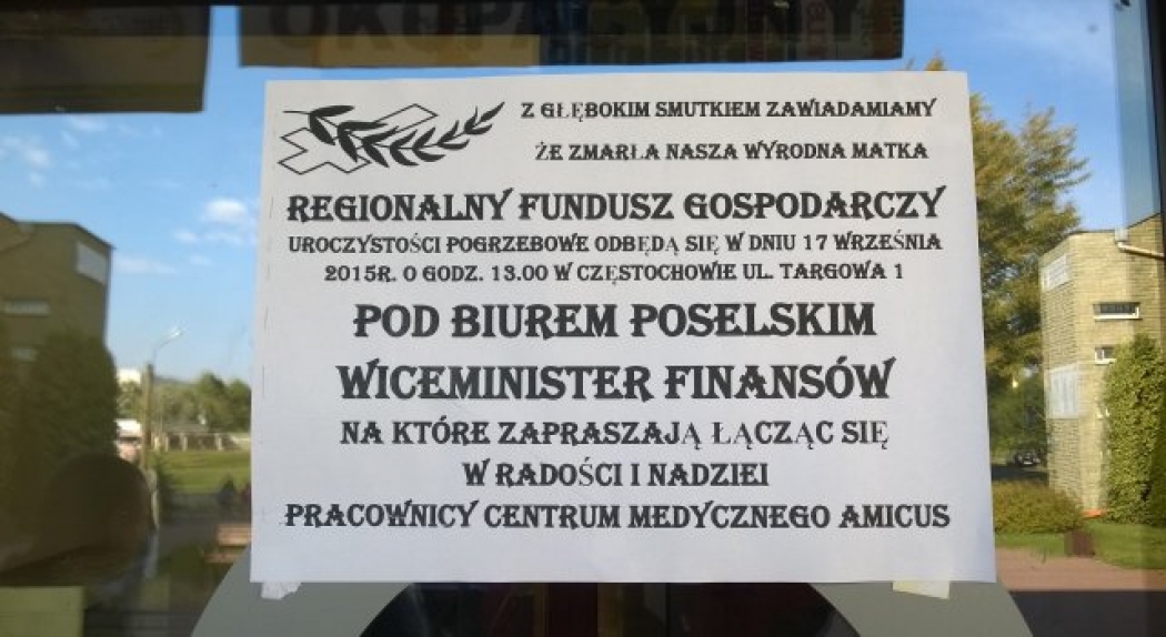 W czwartek 17 września o godz. 13.00 pod biurem poselskim wiceminister finansów Izabeli Leszczyny (PO) przy ul. Targowej w Częstochowie odbędzie się manifestacja w obronie miejsc pracy oraz dla wyrażenia sprzeciwu wobec trybu planowanej prywatyzacji Centrum Medycznego "Amicus".
