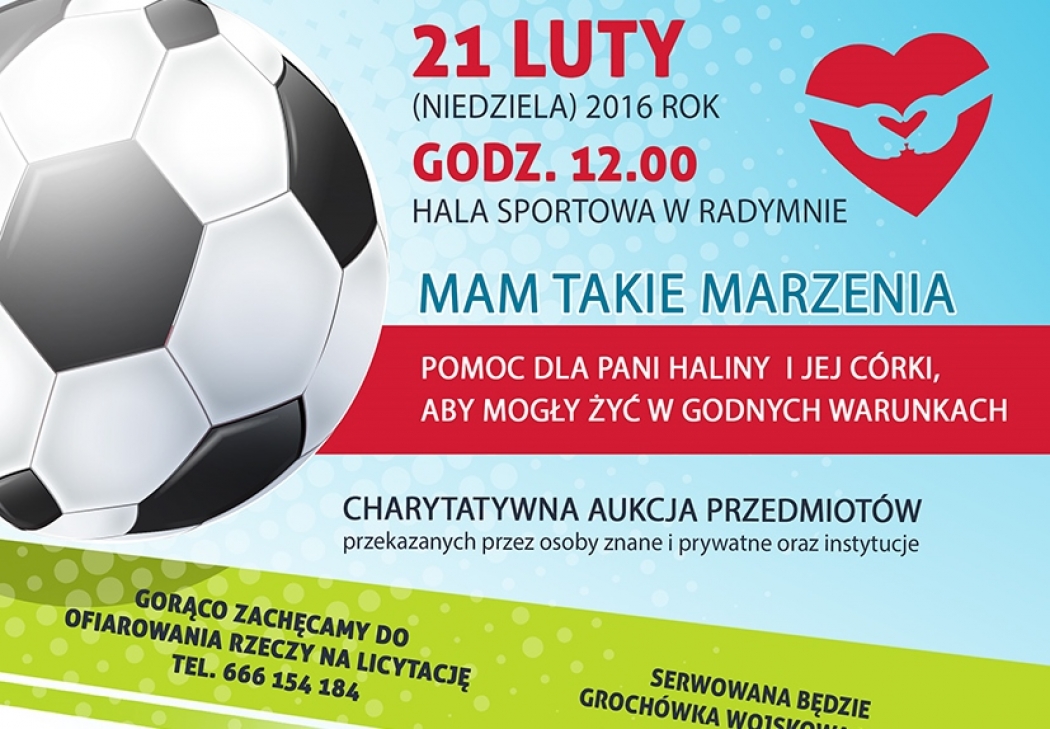W ramach pomocy gorąco zachęcamy do udziału w Charytatywnym Turnieju Halowej Piłki Nożnej Juniorów o Puchar Radnej Sejmiku Województwa Podkarpackiego Anny Huk. Podczas turnieju odbędzie się licytacja rzeczy ofiarowanych przez znanych ludzi oraz osoby prywatne i instytucje.