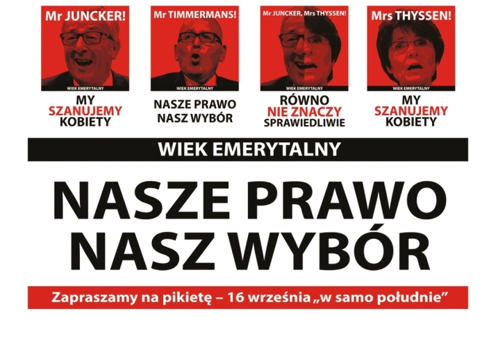Wiek emerytalny to nasze prawo i decyzja. Nie zgadzamy się na ingerencję unijnych urzędników w decyzje polskich obywateli. Dlatego 16 września odbędzie się przed warszawską siedzibą Komisji Europejskiej pikieta protestacyjna, przeciwko działaniom unijnych urzędników w sprawie polskiego wieku emerytalnego.
