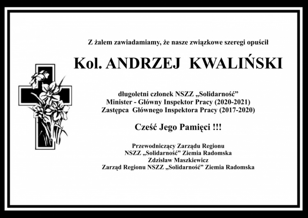 Zarząd Regionu NSZZ "Solidarność" Ziemia Radomska informuje, że uroczystości pogrzebowe Andrzeja Kwalińskiego odbędą się 12 stycznia 2021 r. o godz. 11.00 w Radomskiej Katedrze, gdzie zostanie odprawiona msza żałobna za duszę Zmarłego. Po nabożeństwie nastąpi wyprowadzenie ciała Zmarłego na cmentarz przy ul. Warszawskiej 15.