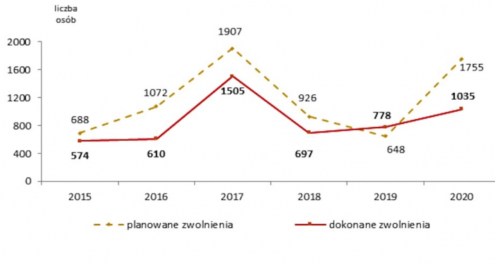 Pomorskie Obserwatorium Rynku Pracy podsumowało sytuację związaną ze zwolnieniami grupowymi na przestrzeni ostatnich lat. Porównane zostały dane pokazujące plany, jak i ich realizację (przedstawiamy je na poniższej grafice).
