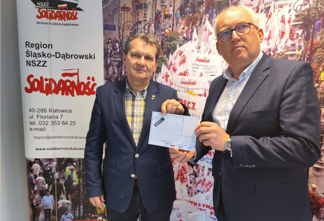 W imieniu Prezydium Zarządu Regionu Śląsko-Dąbrowskiego NSZZ „Solidarność” pocztówkę do białoruskiej ambasady wysłali zastępcy przewodniczącego Mirosław Truchan i Dariusz Gierek. Podkreślili, że „S” stanowczo sprzeciwia się łamaniu praw człowieka i represjonowaniu niezależnych działaczy związkowych na Białorusi.