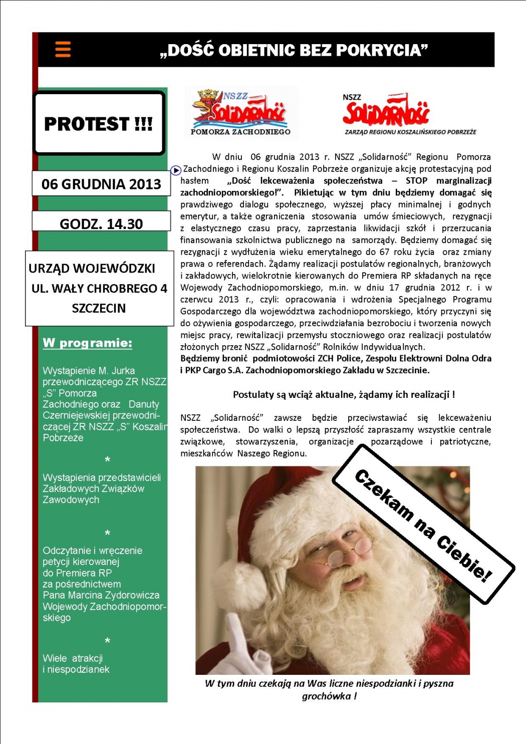 Zarząd Regionu NSZZ „Solidarność” Pomorza Zachodniego w Szczecinie działając na podstawie Decyzji Prezydium KK nr 129/2013 w ramach Ogólnopolskich Dni Protestu postanawia przeprowadzić w dniu 6 grudnia 2013 r. w godz. od 14.30 do 16.30 pod Zachodniopomorskim Urzędem Wojewódzkim w Szczecinie akcję protestacją przebiegającą pod hasłem „Dość lekceważenia społeczeństwa”.