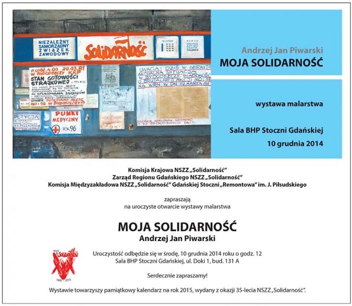 KK NSZZ „Solidarność”, ZR Gdańskiego, KM Gdańskiej Stoczni „Remontowa” im. J. Piłsudskiego zapraszają na uroczyste otwarcie wystawy malarstwa znanego malarza i grafika Andrzeja Jana Piwarskiego "Moja Solidarność"