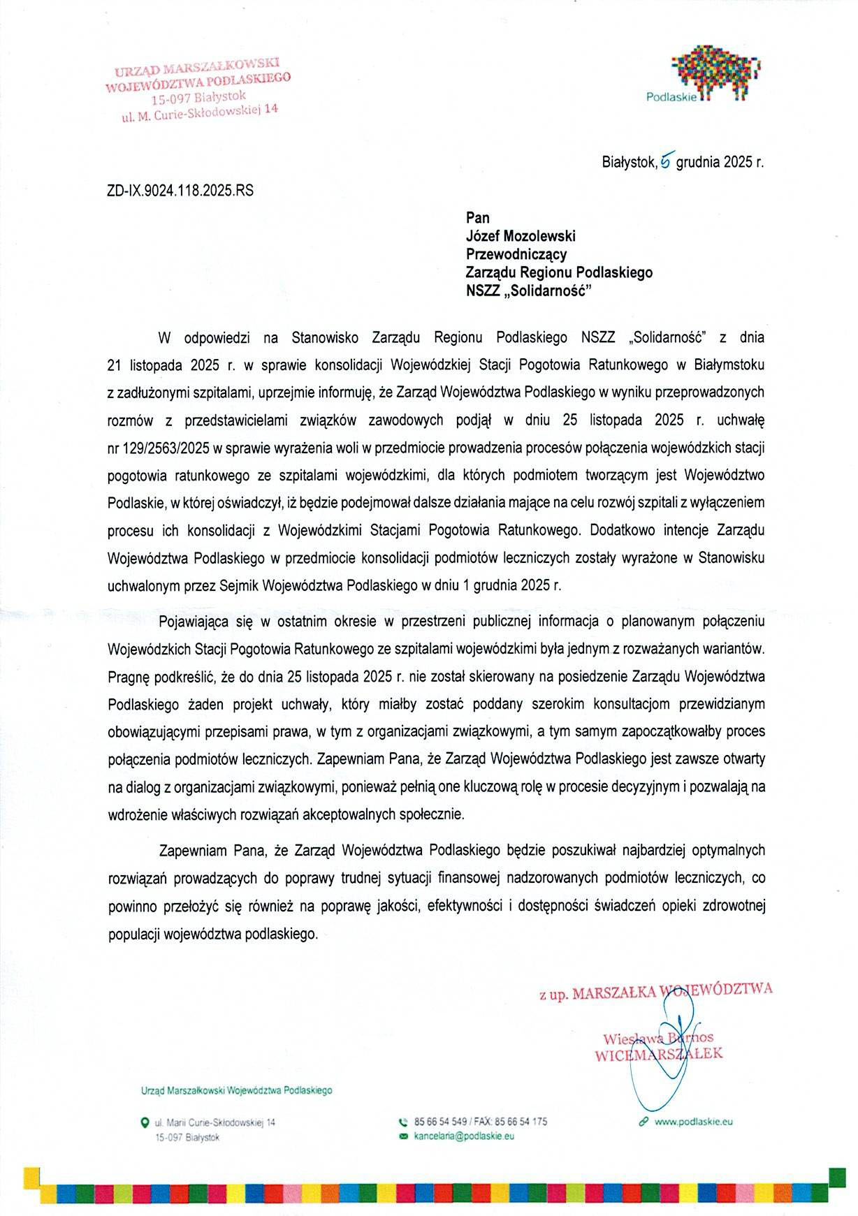 Urząd Marszałkowski udzielił odpowiedzi na stanowisko Zarządu Regionu Podlaskiego NSZZ "Solidarność" wyrażające sprzeciw wobec planów Zarządu Województwa Podlaskiego dotyczących włączenia Wojewódzkiej Stacji Pogotowia Ratunkowego w Białymstoku, Suwałkach i Łomży w struktury konsolidacyjne z zadłużonymi szpitalami wojewódzkimi.