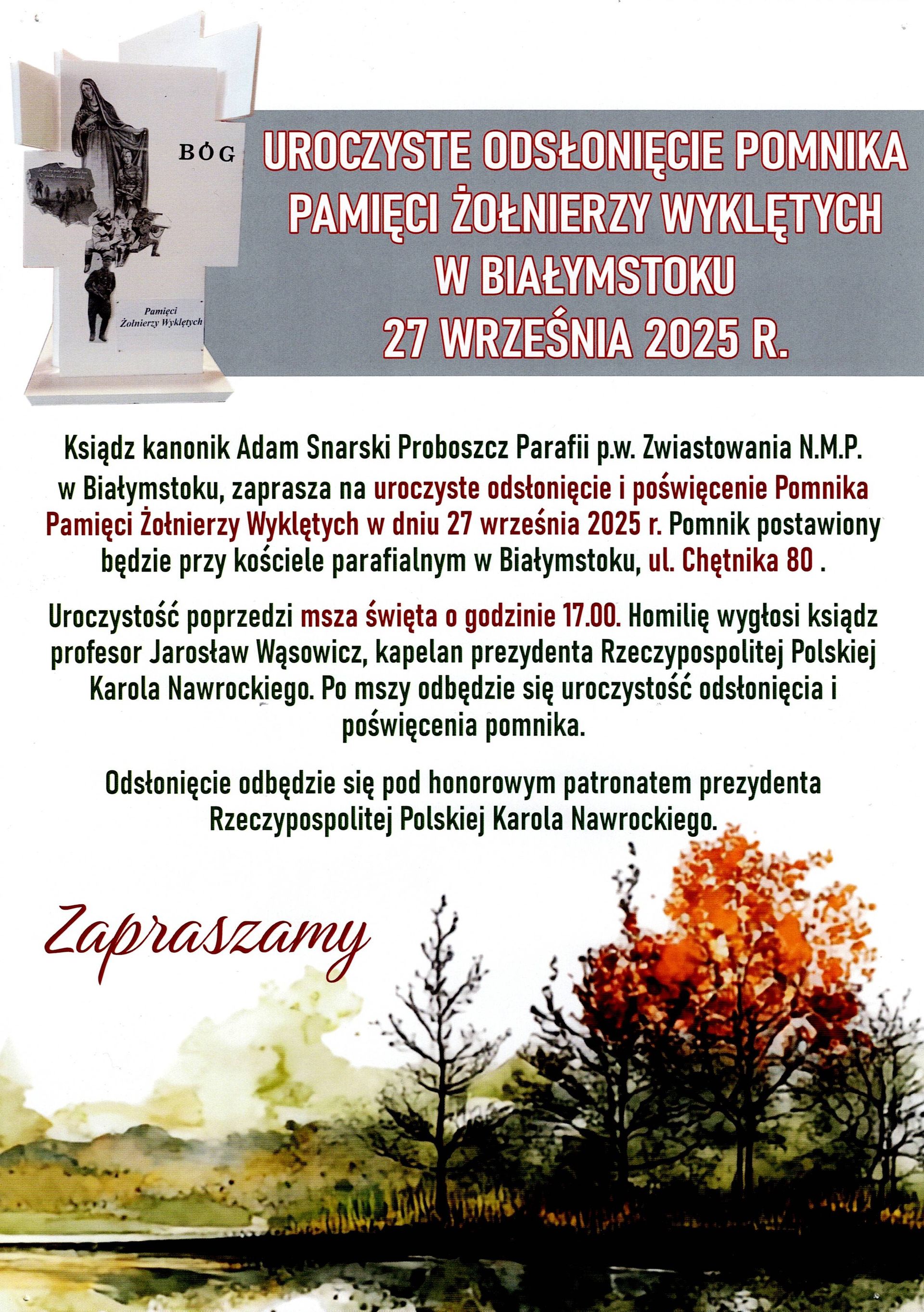 27 września 2025 roku odbędzie się uroczyste odsłonięcie i poświęcenia Pomnika Pamięci Żołnierzy Wyklętych. Serdecznie zapraszamy.