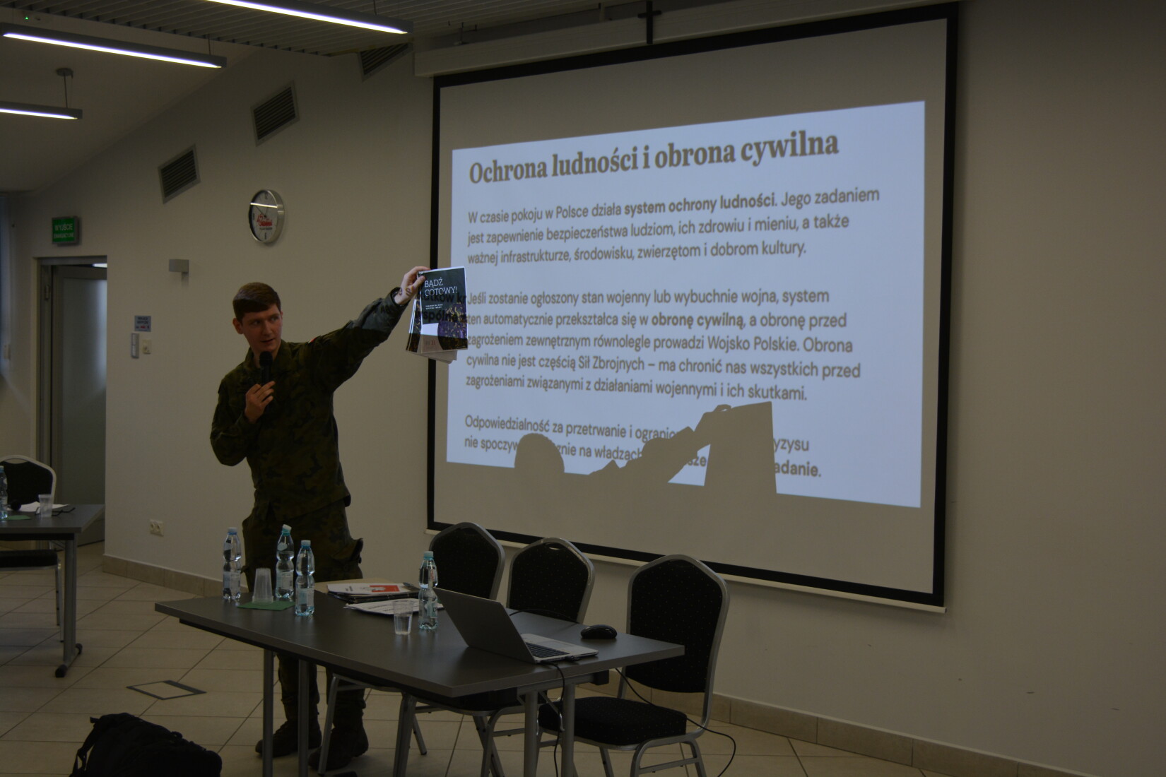Profesor dr hab. Daniel Boćkowski z Uniwersytetu w Białymstoku powiedział o tym jak należy się zachować w razie kryzysu, gdy wszystkie służby zostaną zmobilizowane i będą podlegać wojsku. Uczestnicy otrzymali także wiele praktycznych porad. Dowiedzieli się m.in. dlaczego w dużym mieście nie należy chronić się wzdłuż ścian budynków oraz czy warto poruszać się samochodem w czasie kryzysu, a także do czego można wykorzystać przedmioty codziennego użytku, takie jak: podgrzewacze czy latarka.