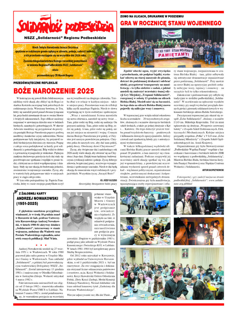 W najnowszym numerze „Solidarności Podbeskidzia” znajdziemy m.in. pełny tekst najnowszego stanowiska Komisji Krajowej z gorzką diagnozą obecnej sytuacji społeczno-politycznej Polski. Niestety, potwierdzeniem, że jest źle, są zamieszczone w tym samym numerze ponure wieści z PG Silesia i spółki Aptiv. Na naszych łamach piszemy też o przebiegu ósmej Gry Ulicznej „Tropami Solidarności”. Wspominamy także zmarłego w grudniu Andrzeja Nowakowskiego z Wadowic. To ostatni numer w tym roku, więc nie mogło zabraknąć życzeń – od przewodniczącego Marka Bogusza i naszego duszpasterza ks. Józefa Oleszki…