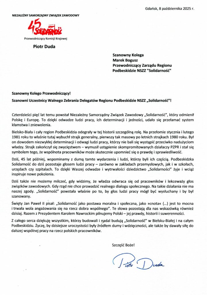 Później specjalny gość zjazdu, wiceprzewodniczący Komisji Krajowej Grzegorz Adamowicz, odczytał pismo szefa „Solidarności” Piotra Dudy skierowane do podbeskidzkich związkowców. „Nie możemy milczeć, gdy widzimy, że władza odwraca się od pracowników i lekceważy głos związków zawodowych, gdy nie chce prowadzić realnego dialogu społecznego. Na takie działania nie ma naszej zgody. Solidarność powstała właśnie po to, by głos ludzi pracy mógł być wysłuchany i by był szanowany” – napisał przewodniczący Komisji Krajowej życząc podbeskidzkim związkowcom siły do dalszej wspólnej pracy na rzecz polskich pracowników (pełny tekst listu Piotra Dudy można przeczytać TUTAJ).