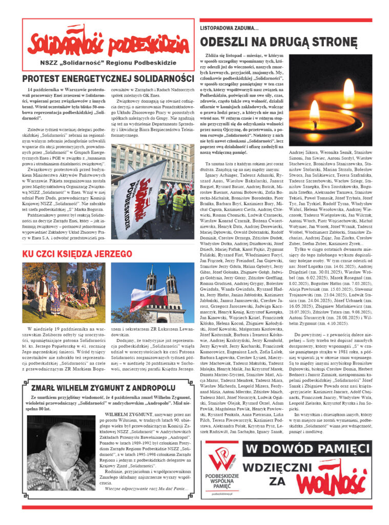 W najnowszym numerze „Solidarności Podbeskidzia” znajdziemy m.in. obszerną relację z obrad XIV Walnego Zebrania Delegatów podbeskidzkiej „Solidarności”. Piszemy też o proteście związkowców zatrudnionych w branży energetycznej. Wspominamy też zmarłego w październiku Wilhelma Zygmunta z andrychowskiego Andropolu, a także – z racji nadchodzącego święta zmarłych – wszystkich działaczy podbeskidzkiej „Solidarności” którzy już od nas odeszli…