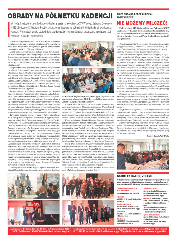 W najnowszym numerze bezpłatnego miesięcznika „Gazeta Beskidzka”, który ukazał się w czwartek 30 października 2025 roku, znajdziemy nowy numer „Solidarności Podbeskidzia”, a w nim…