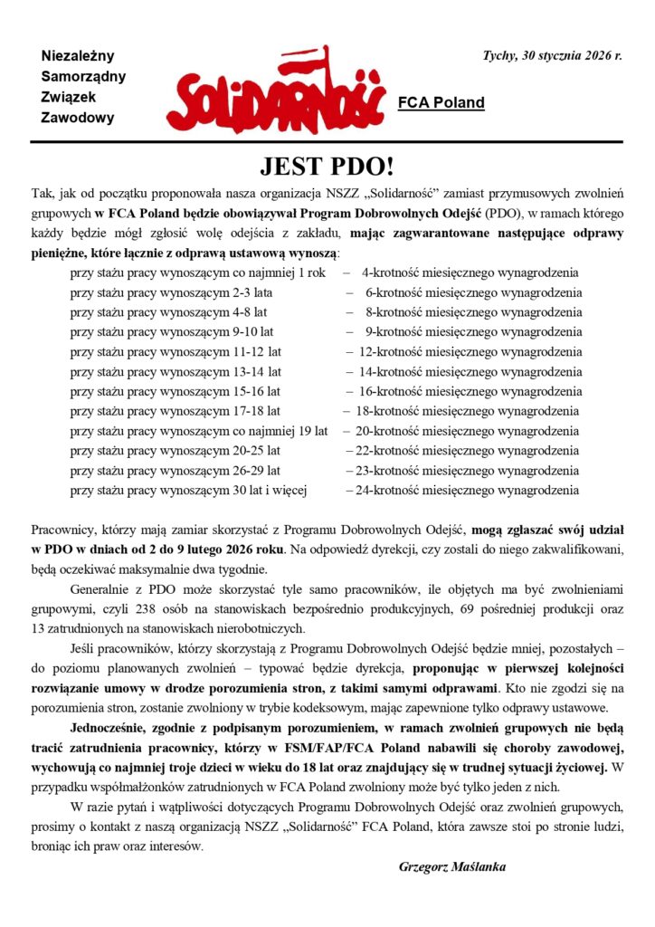 30 stycznia wieczorem związki zawodowe działające w fabryce FCA w Tychach podpisały porozumienie z pracodawcą w sprawie Programu Dobrowolnych Odejść.