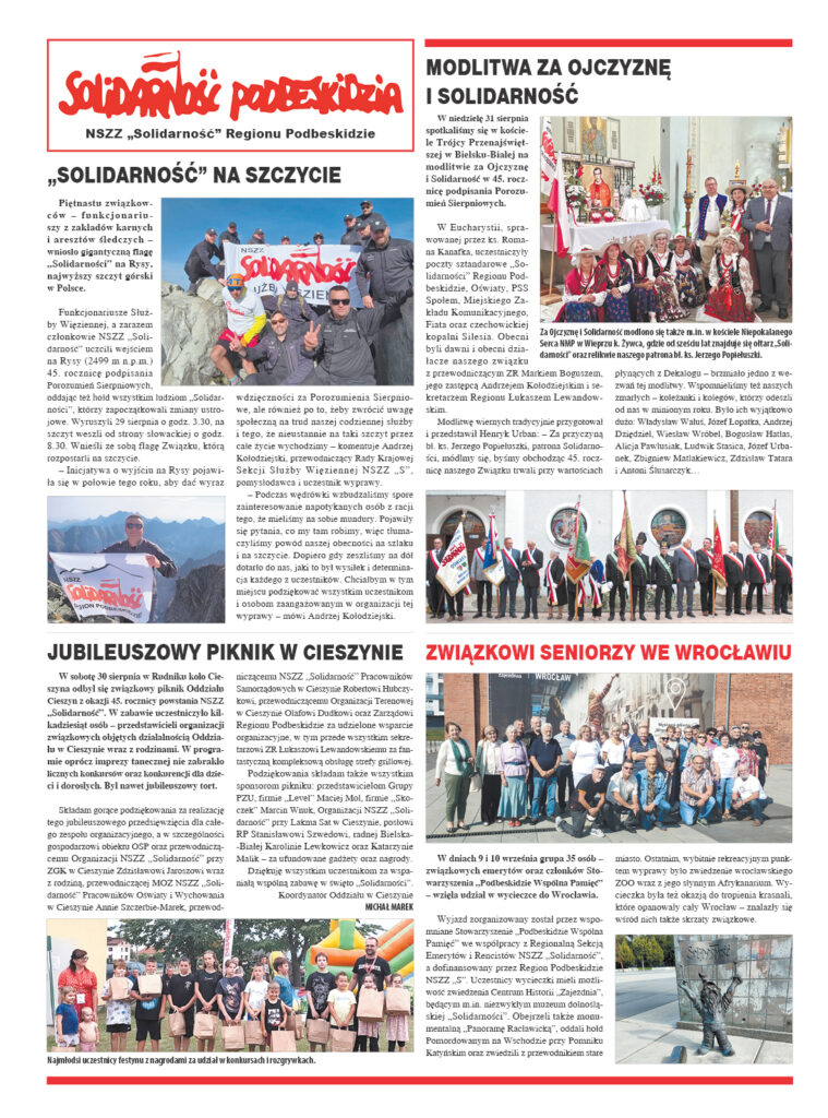 W najnowszym numerze „Solidarności Podbeskidzia” znajdziemy m.in. obszerną relację z naszych obchodów 45. rocznicy powstania „Solidarności” oraz z rajdu „Solidarności” na Skrzyczne. Piszemy też o związkowym wypadzie do Wrocławia oraz manifestacji pracowników Służby Więziennej na ulicach Stolicy. Jest też artykuł o tym, jaka będzie wysokość płacy minimalnej w przyszłym roku. To tylko część tego, co można przeczytać w najnowszej „Solidarności Podbeskidzia”…