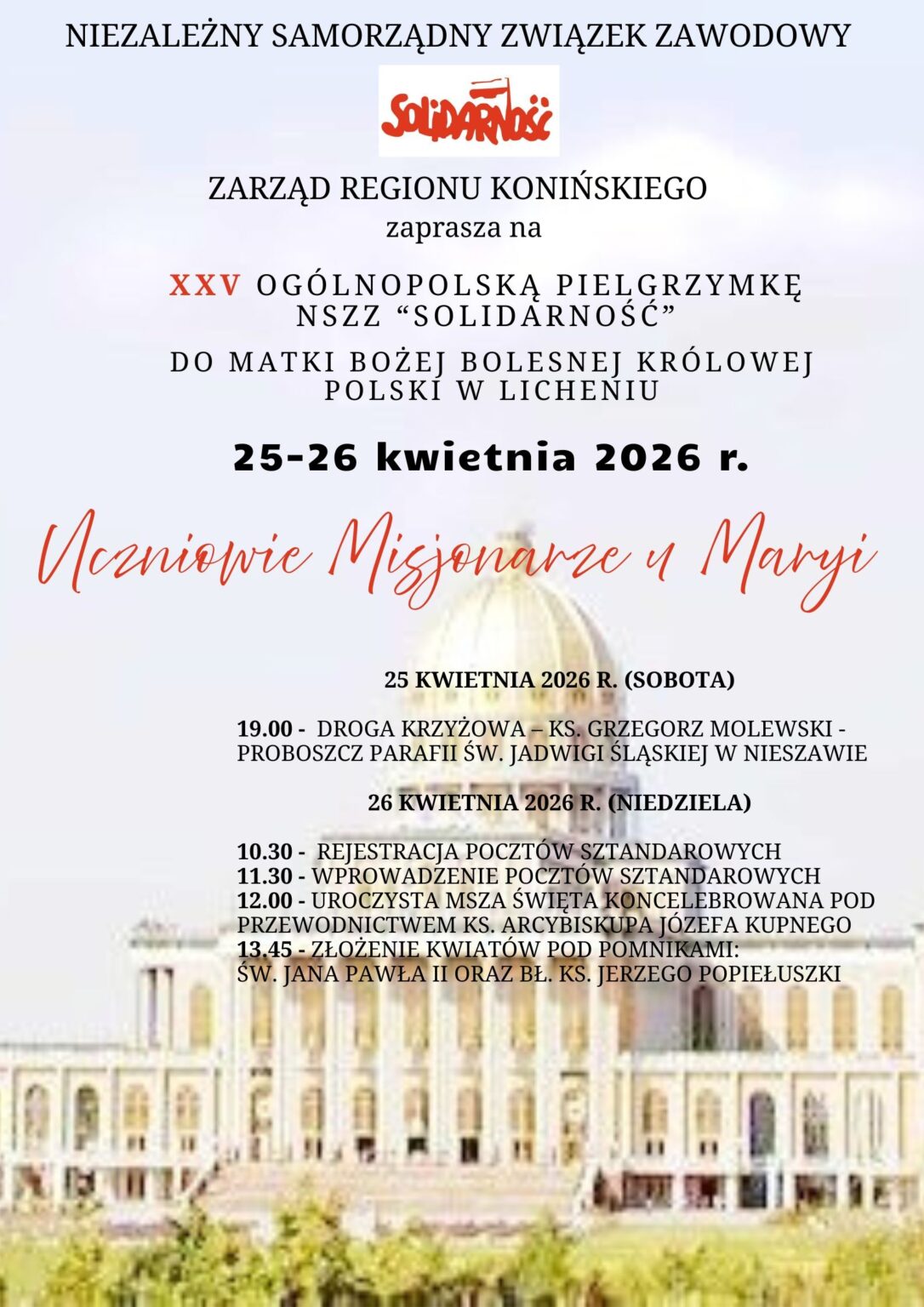 Już w dniach 25–26 kwietnia 2026 r. odbędzie się jubileuszowa, XXV Ogólnopolska Pielgrzymka NSZZ „Solidarność” do sanktuarium maryjnego w Licheniu.