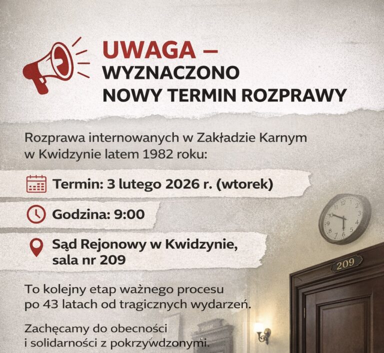 RUSZA KOLEJNY ETAP PROCESU W SPRAWIE KWIDZYŃSKIEJ 3 lutego 2026 roku o godzinie 9:00 w Sądzie Rejonowym w Kwidzynie (sala nr 209) odbędzie się kolejna rozprawa w sprawie brutalnego pobicia internowanych, do którego doszło 14 sierpnia 1982 roku w Zakładzie…