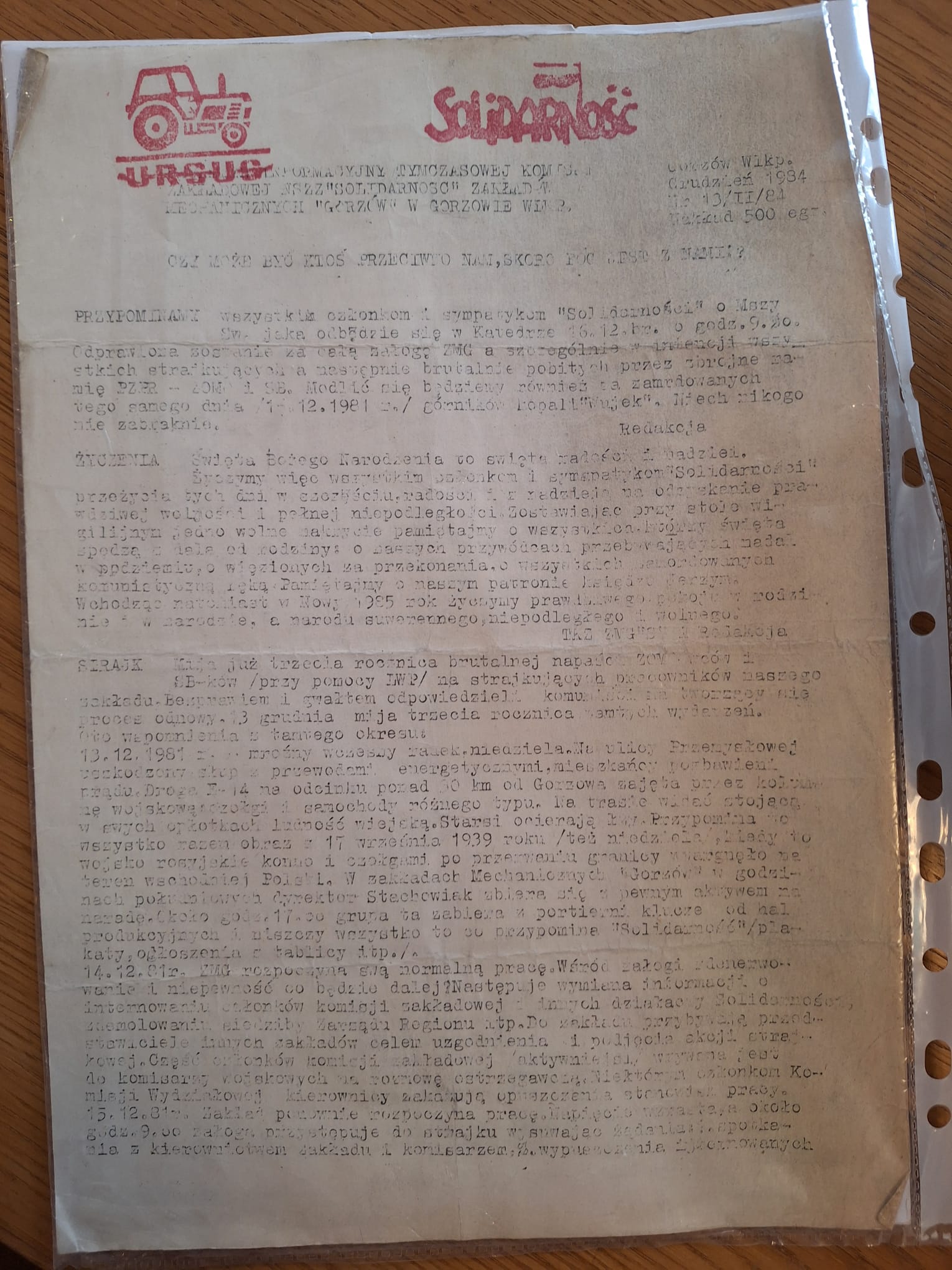 Jak co roku 16 grudnia w rocznice brutalnej pacyfikacji strajku spotkali się przy tablicy upamiętniającej tamto smutne wydarzenie uczestnicy strajku, pracownicy URSUSA, ludzie „Solidarności”, członkowie Zarządu Regionu Gorzów NSZZ Solidarność . W okolicznościowym spotkaniu uczestniczyły też Poczty Sztandarowe NSZZ Solidarność byłych ZM URSUS, Zarządu Regionu i Gorzowskiej Enei.
