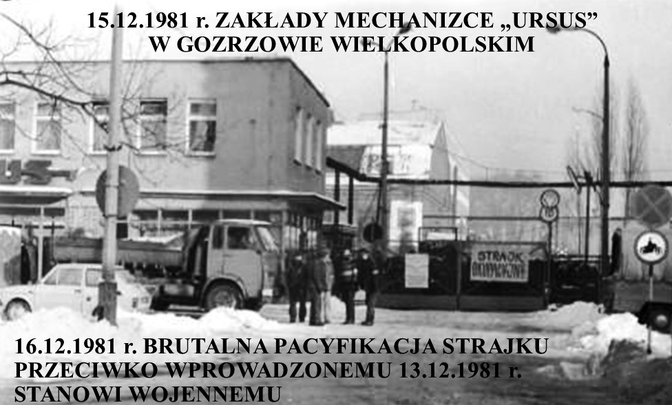 Strajk w Zakładach Mechanicznych, zwanych potocznie Ursusem, rozpoczął się 15 grudnia 1981. Strajkowała większość z załogi, która wówczas liczyła (łącznie z filią w Sulęcinie) około 2 tys. osób. Pracownicy domagali się zakończenia stanu wojennego, oraz wypuszczenia aresztowanych działaczy NSZZ „Solidarność”. Nad ranem 16 grudnia 1981 doszło do pacyfikacji protestu. Na teren zakładu wjechał czołg, który staranował bramę do hali, w której przebywali strajkujący. Do strajkujących strzelano z granatów z gazem łzawiącym. Dla uciekających ZOMO-wcy stworzyli „ścieżkę zdrowia”. Bito, kopano, okładano pałkami milicyjnymi nawet leżących. Zatrzymano ponad 70 osób, część z nich została skazana na drakońskie kary nawet 5 lat więzienia.