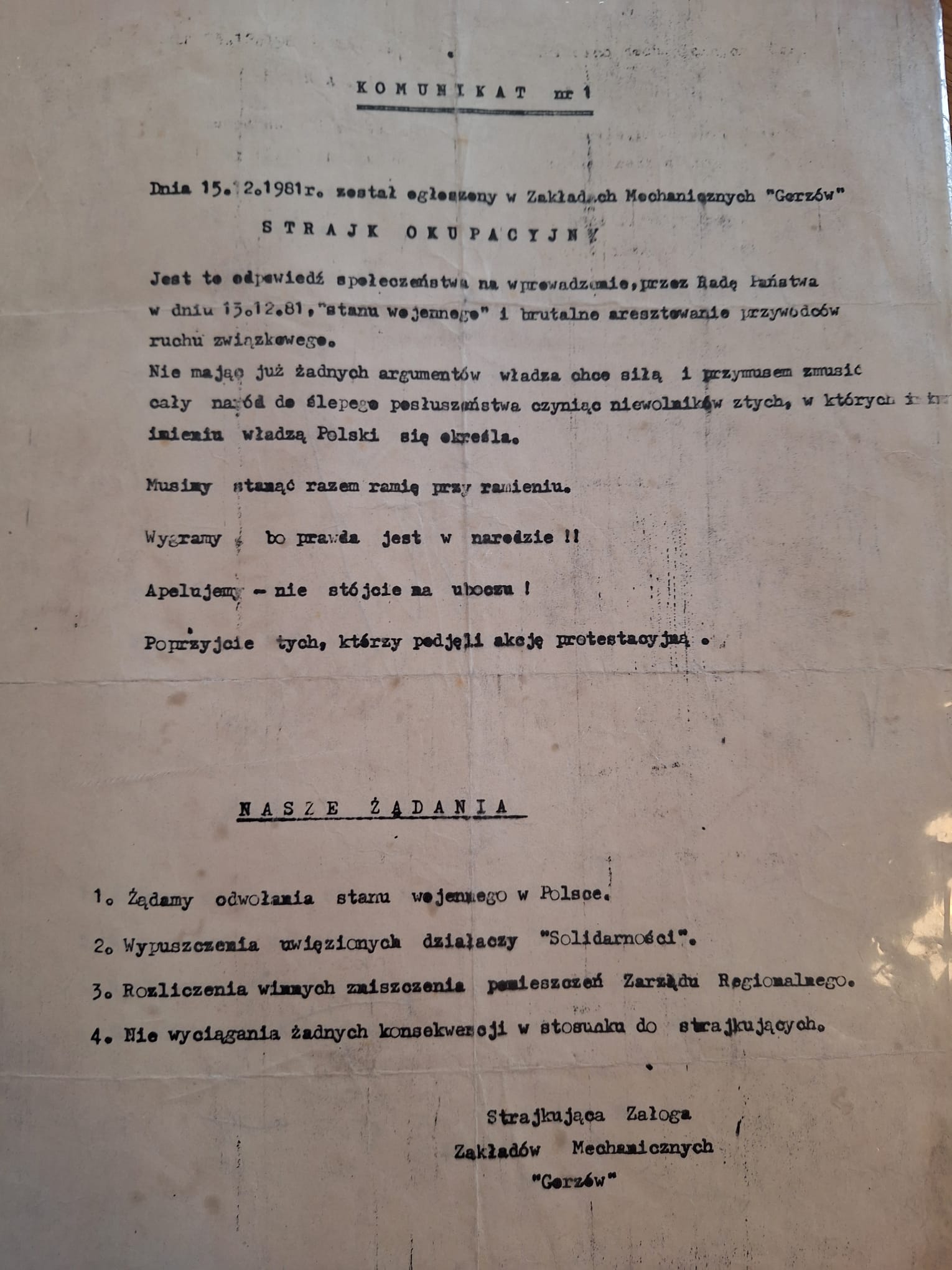 Waldemar Rusakiewicz , Przewodniczący Gorzowskiej Solidarności podziękował wszystkim przybyłym na rocznicowe obchody oraz pamięć historyczną o dramatycznych wydarzeniach w Zakładach Mechanicznych. „ Dziś oddajemy hołd tym, którzy mieli odwagę stanąć przeciwko komunistycznej władzy. Dziś chcemy tym ludziom podziękować, wyrazić szacunek i powiedzieć, że ich trud nie poszedł na marne, bo to był ich wkład w drogę do wolności” powiedział Przewodniczący Rusakiewicz. Następnie ks. Zbigniew Samociak, Kapelan NSZZ „Solidarność” Regionu Gorzowskiego poprowadził modlitwę w intencji wszystkich , którzy utracili zdrowie i życie walcząc o Wolną Polskę.