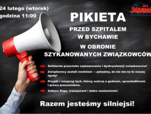 24 lutego przed siedzibą szpitala w Bychowie odbędzie się pikieta członków NSZZ „Solidarność” Regionu Środkowo-Wschodniego w obronie szykanowanych związkowców. Szpital...